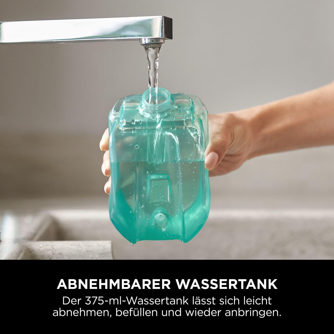 - Der grosszügige, 375 ml fassende Wassertank kann leicht entfernt, befüllt und befestigt werden