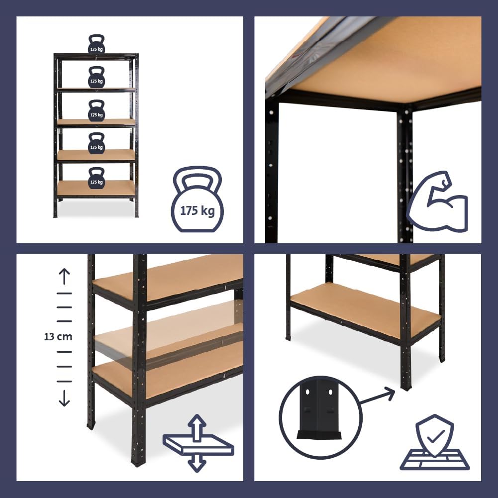 - STABIL & HOCHWERTIG – Die Traglast des Schwerlastregal Steckregal mit beschichteten Stahl beträgt 175kg pro Boden. Dadurch ist unser Garagen Regal nicht nur ein zuverlässiges Lagerregal, sondern auch als Regal Abstellraum Ordnungssystem geeignet.