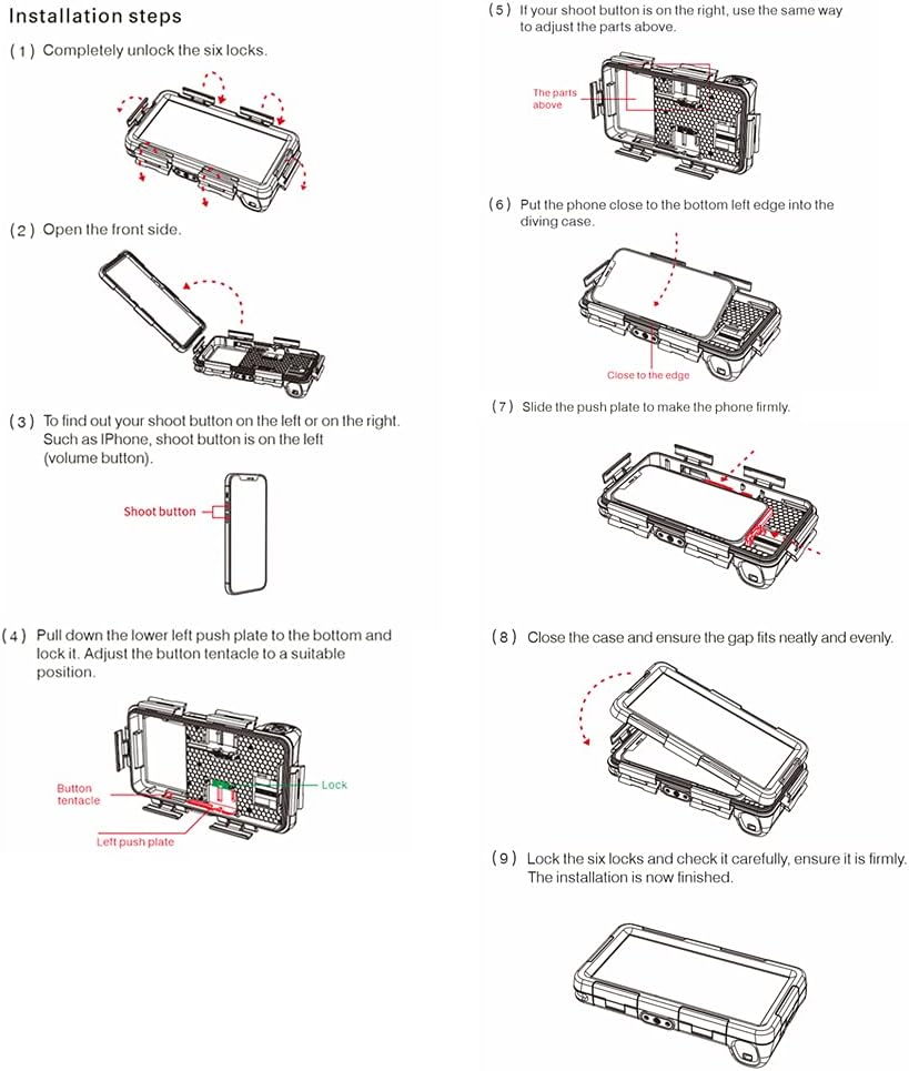 - Schnelleinrichtung: Setzen Sie Ihr Telefon ein und schliessen Sie den Koffer. Alles was Sie tun müssen, ist die Kamera oder das Video einzuschalten, bevor Sie unter Wasser sind. Das wasserdichte Gehäuse hat ein "Shutter" -Design. Um alle Details Ihres