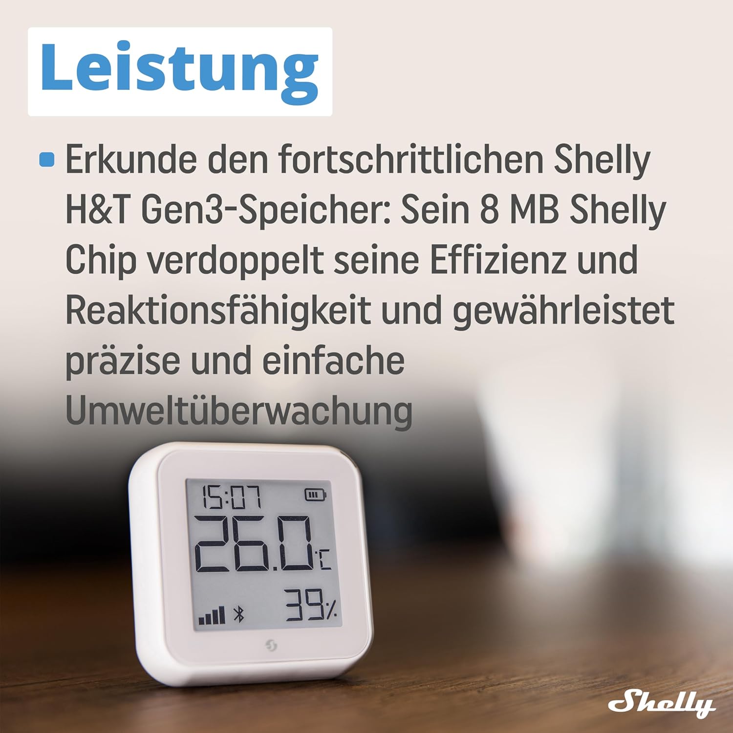 - Shelly H&T Gen 3 Weiss ist ein Wi-Fi- und Bluetooth-Temperatur- und Luftfeuchtigkeitssensor der nächsten Generation, der mit dem neuen Shelly-Chip ausgestattet ist: 8 MB Speicher und schnellere Reaktionsfähigkeit. Funktioniert mit Typ-C-USB-Steckplatz