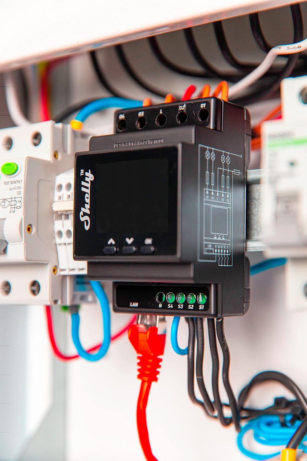 PRODUKTBESCHREIBUNGEN Shelly Pro 4PM ist ein 4-Kanal-DIN-Schienen-Relaisschalter mit WLAN-, LAN- und Bluetooth-Verbindung. Im Wesentlichen ist es geeignet für Haus- und Hausautomation mit Fernbedienung und kann auf DIN-Schiene in einer Schalterbox montiert werden, um Lichter, Steckdosen und Schalter zu steuern und zu automatisieren. Es verfügt über erweiterte Sicherheitsfunktionen, die mit den am häufigsten verwendeten Heimautomatisierungsplattformen kompatibel sind. Der Shelly PRO 4PM verfügt über LAN-, Wi-Fi- und Bluetooth-Verbindung mit 4 Ausgängen, mit 16 A Strom mit sauberem Kontakt. Die Shelly "Pro" Serie ist eine Reihe von Geräten, die sich für Wohnungen, Büros, Einzelhandelsgeschäfte, Produktionsstätten und andere Gebäude eignen. Shelly Pro-Geräte sind DIN in der Schalterbox montierbar. Die Konnektivität für alle Shelly Pro-Geräte kann über WiFi- oder LAN-Internetverbindung und Bluetooth erfolgen, die Sie auch verwenden können, um den Prozess der Aufnahme in die App Shelly und unser Netzwerk zu erleichtern. Das Shelly Pro 4PM wird mit AC110-240V Wechselstrom und in 12V Gleichstrom betrieben. Funktioniert bei Temperaturen von 0 bis 40 °C. Es ist auch mit einem LAN-Anschluss ausgestattet, um eine hohe Stabilität und Zuverlässigkeit zu gewährleisten. Darüber hinaus ermöglicht es uns durch die Verwendung von LAN und Wi-Fi mit 2,4 GHz die Sicherung Ihrer Daten, einschliesslich des Verlaufs. Unterstützt gleichzeitig den Access Point- und Client-Modus. Es hat eine Reichweite von bis zu 50 m im Freien und bis zu 30 m im Innenbereich für die Fernsteuerung unserer Shelly Pro 4PM-gesteuerten Geräte. Shelly Pro 4PM ermöglicht es uns, wie alle Geräte der Familie "PRO" und "Plus", HTTPS-Webhooks und MQTT-Protokoll zu verwalten. Stunden- oder Tagesprogrammierungen, Animationen basierend auf Sonnenaufgang und Sonnenuntergang und darüber hinaus individuelle Szenen zum Ein- und Ausschalten von Lichtern und Steckdosen nach Ihren Bedürfnissen.