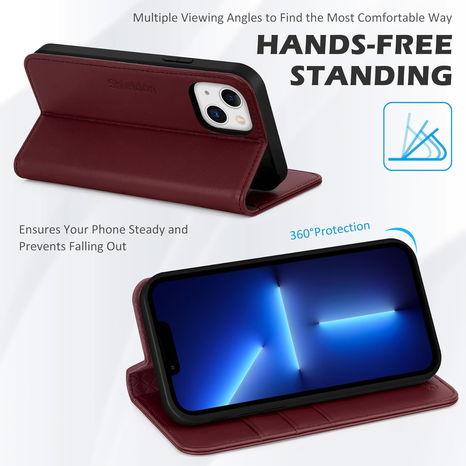 SHIELDON Hülle für iPhone 13, Praktische Handyhülle [3 Kartenfächer] [Echtes Rindsleder] [Standfunkt