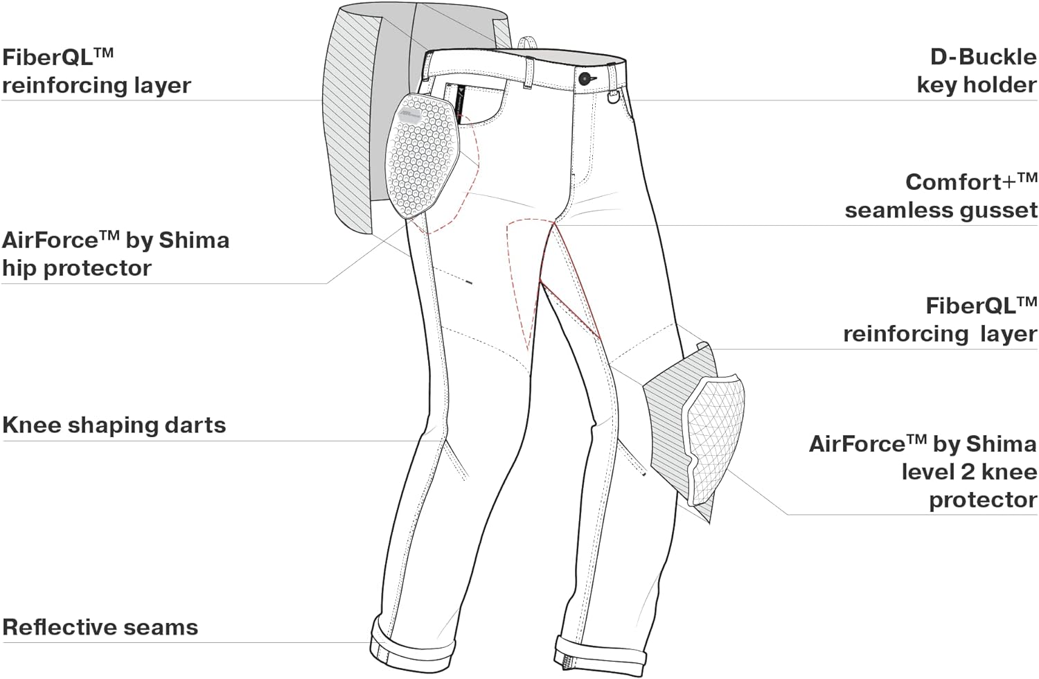- SCHUTZ: AirForce-Knie- und Hüftprotektoren, abriebfeste FiberQL-Verstärkungen in Schlüsselbereichen, Taschen für optionale Hüft- und Steissbeinprotektoren.