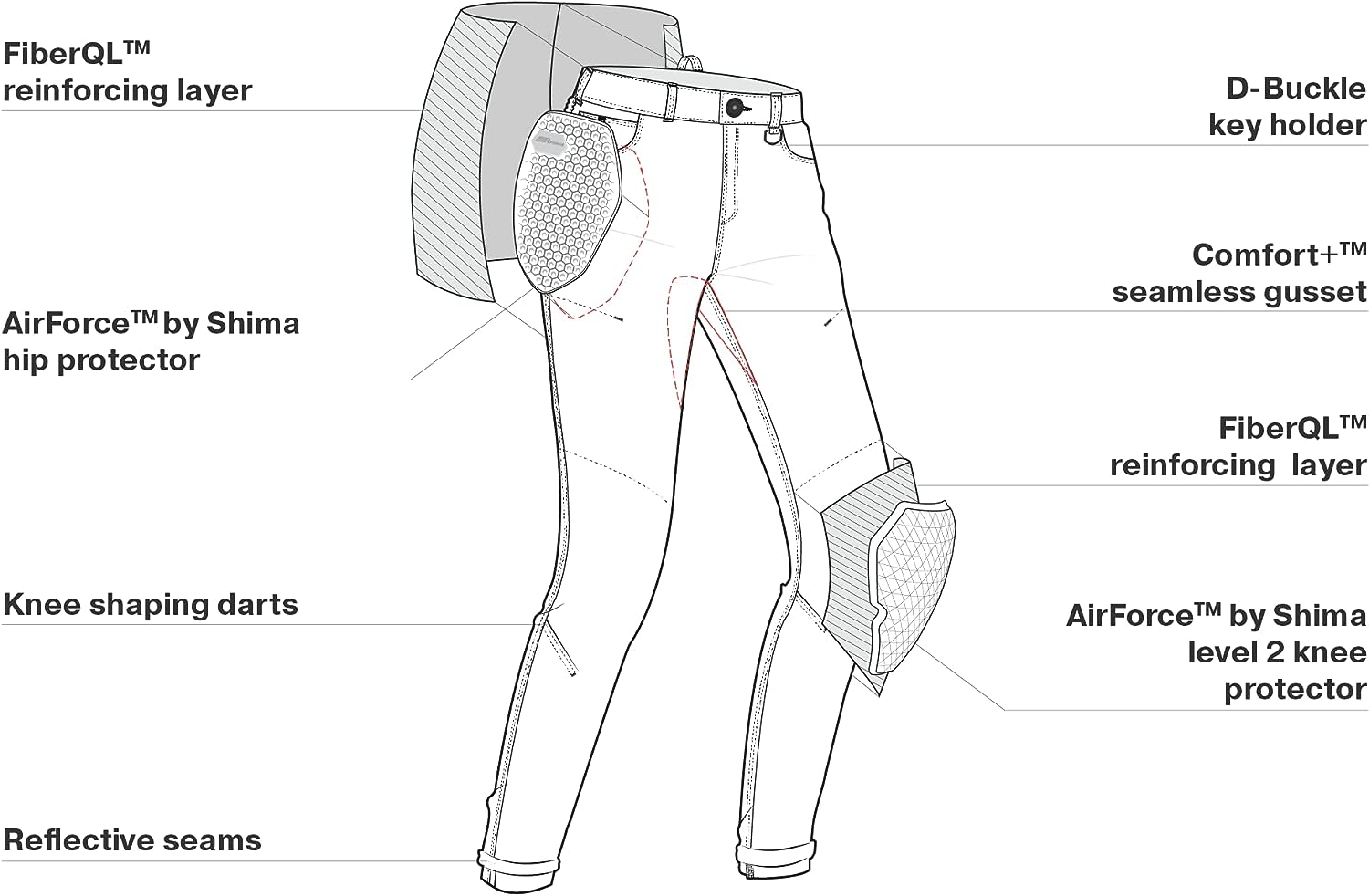- SCHUTZ: AirForce-Knie- und Hüftprotektoren, abriebfeste FiberQL-Verstärkungen in Schlüsselbereichen, Taschen für optionale Hüft- und Steissbeinprotektoren.