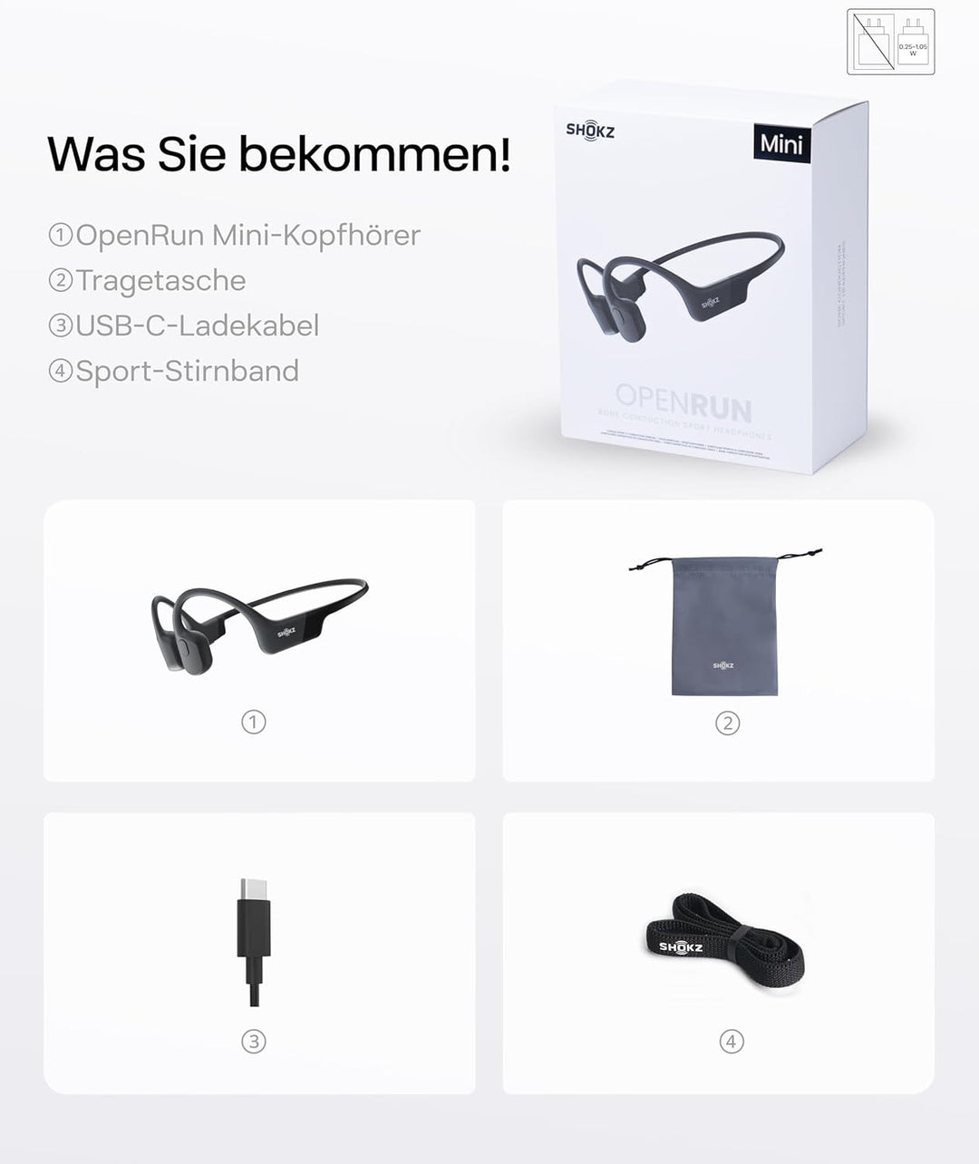 - Kleinere Grösse, besserer Sitz: Mit dem um 0,83"/21mm kürzeren Band ist das OpenRun Mini die ideale Wahl für eine bessere Passform. Jetzt gibt es für jede Kopfgrösse einen passenden Shokz-Kopfhörer. Auch ideal für Brillen und Fahrradhelme.
