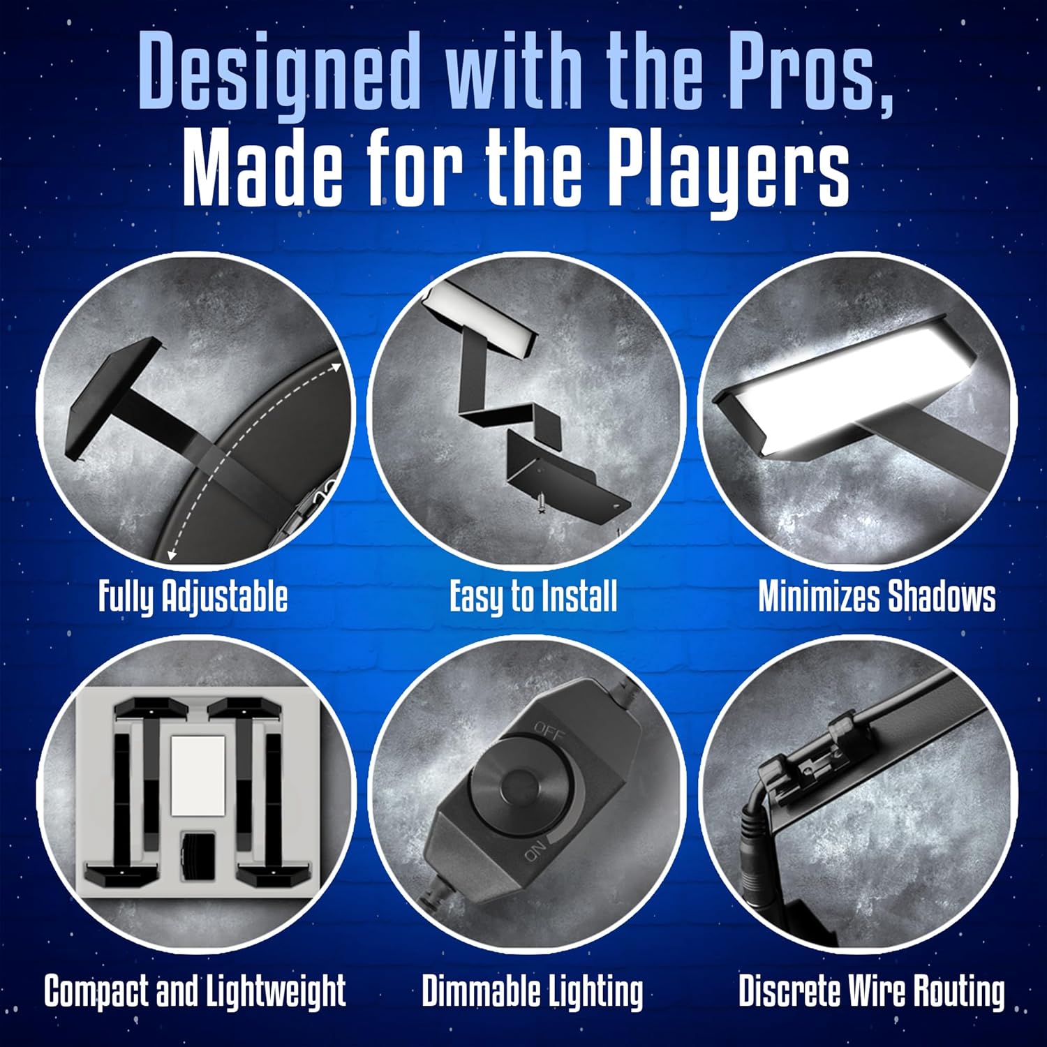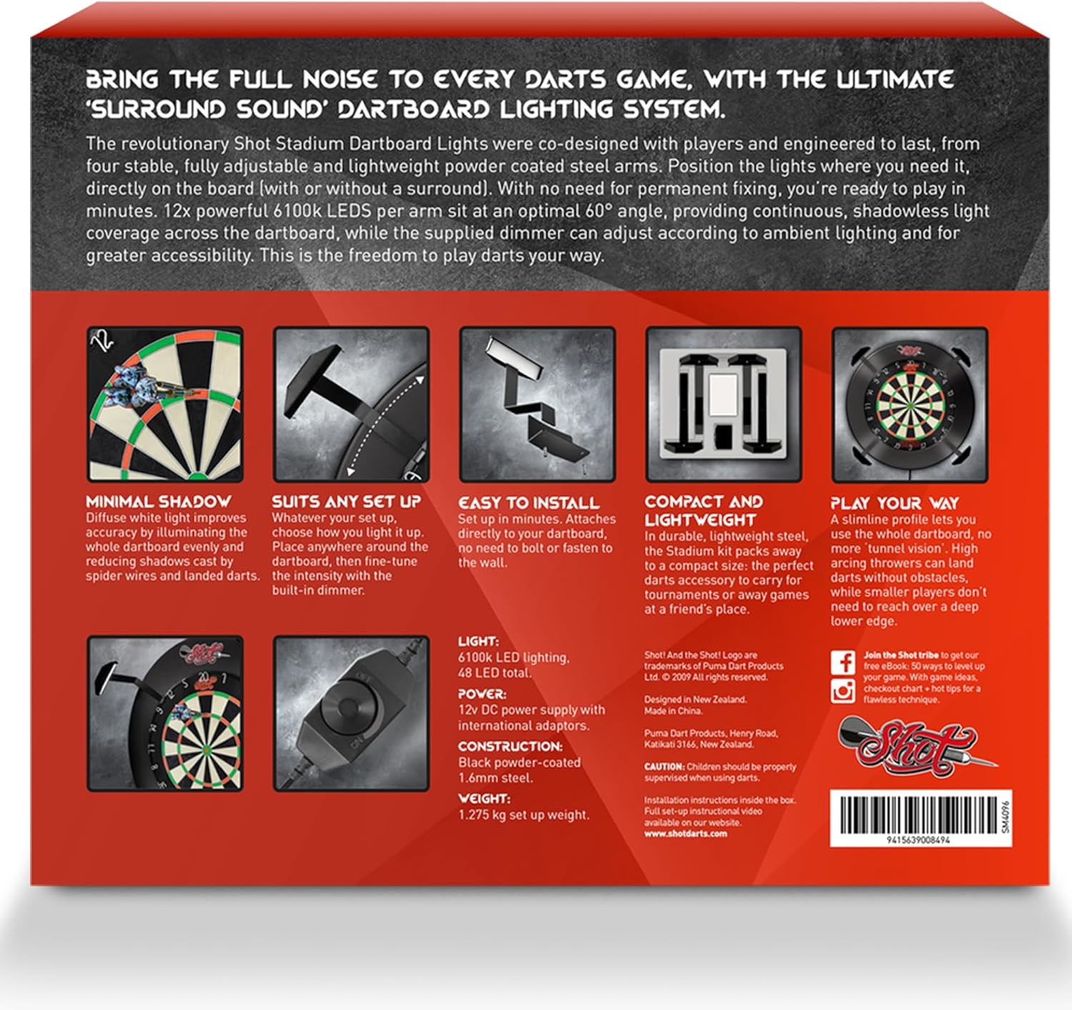 - Minimal Shadow Diffuses weisses Licht verbessert die Genauigkeit, indem das gesamte Dartboard gleichmässig beleuchtet wird und Schatten von Spinnendrähten und landed Darts reduziert.