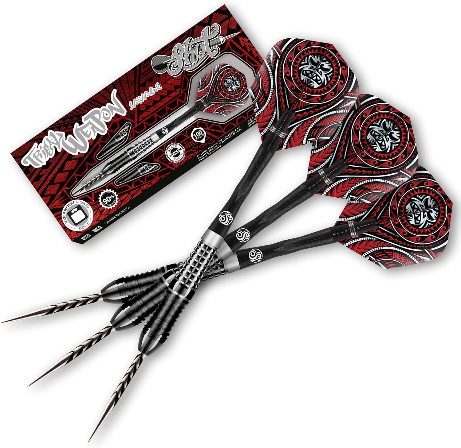 - Vollendet wird der Dartpfeil mit einer geläserten Tribal Weapon Black Titanium Cinder Grip Stahl Spitze, TAO Carbon Intermediate IM Shafts und Tribal Weapon Savage Flights, Flightform / Shape: Standard Nr.6