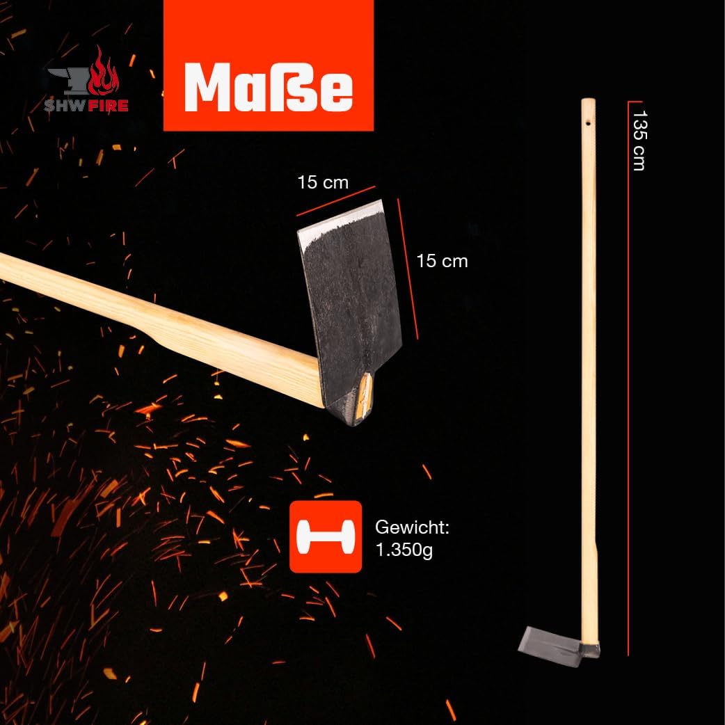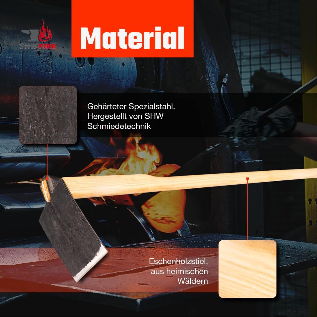 - LIEFERUMFANG: 1x Original SHW-FIRE Regensburger Hacke mit Breitblatt; mit speziell verkeiltem Eschenstiel für einen extra festen Sitz ; dieser verhindert ein Herausfallen und Wackeln des Blattes