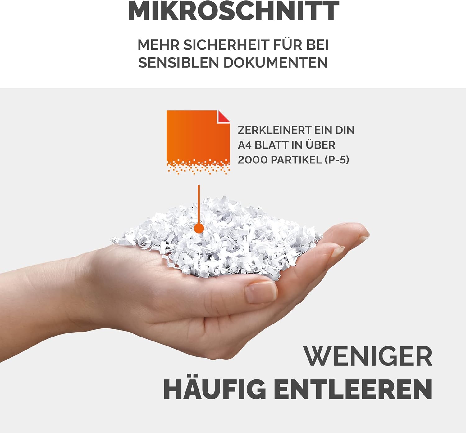 - HOHE SICHERHEIT - für Ihre vertraulichen Dokumente bietet der 10M Microcut Aktenvernichter mit P-5 Mikroschnitt - er schneidet jedes A4 Blatt in über 2000 winzige Partikel, die 10x kleiner sind als Standard Cross-Cut Partikel