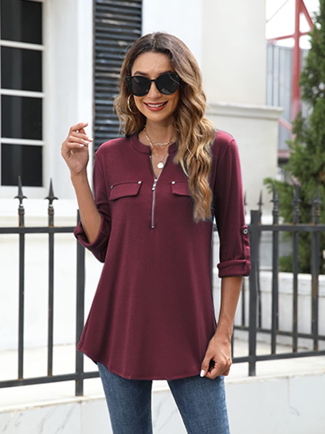Siddhe Damen V-Ausschnitt Bluse 3/4 Ärmel Tunika Reissverschluss Langshirt Langarm Hemd Tops T-Shirt
