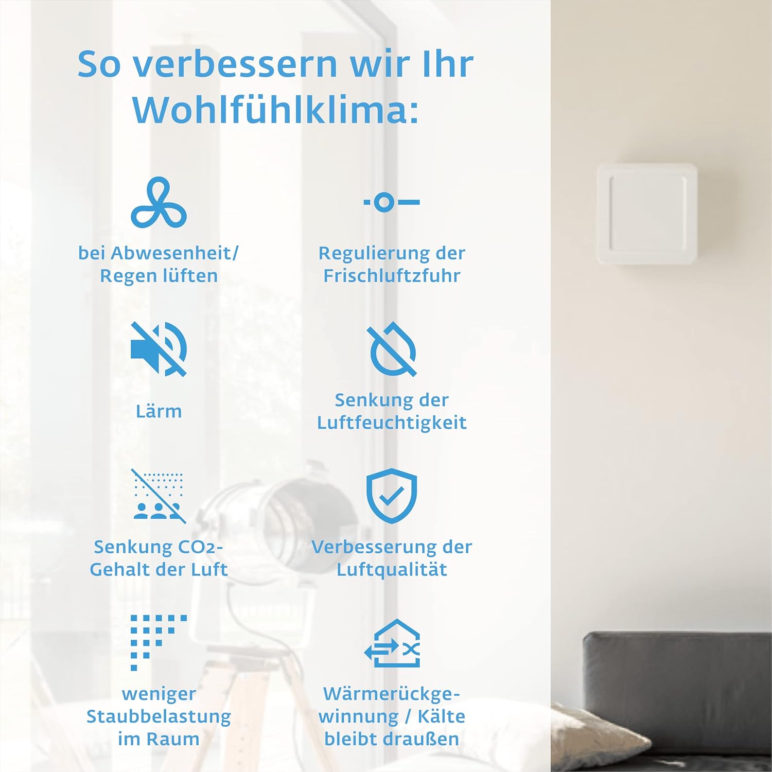 - LIEFERUMFANG: SIEGENIA AEROTUBE WRG smart, Wetterschutz, Lüftungsrohr & - einleger, Speicherstein, Axialventilator, Filter, Gehäuse mit Verschlussschieber & Frontblende, Montage-Set (OHNE Netzstecker)