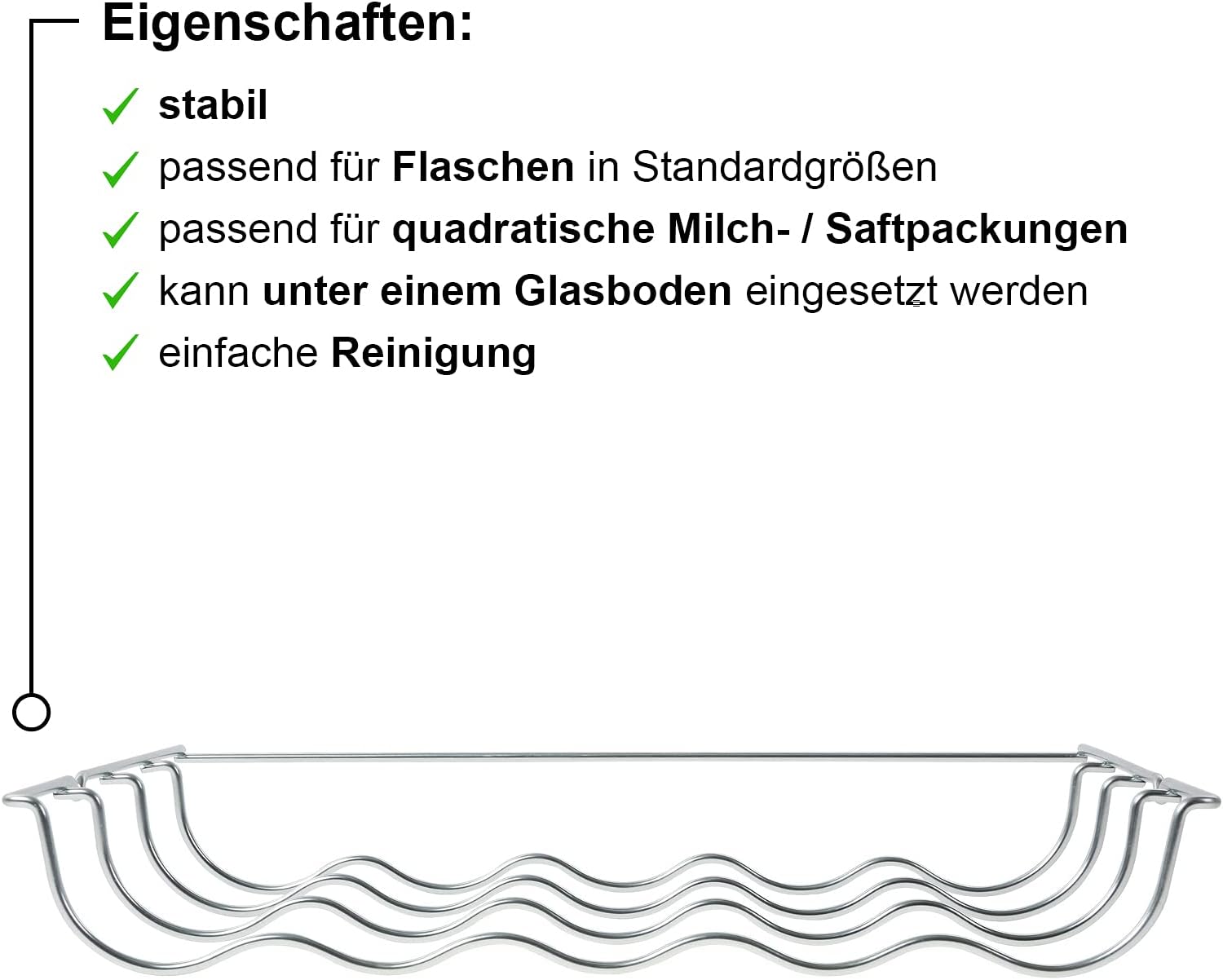 • Einfach und platzsparend Flaschen (Standardgrössen) und quadratische Milch-/Saftpackungen im Kühlschrank aufbewahren