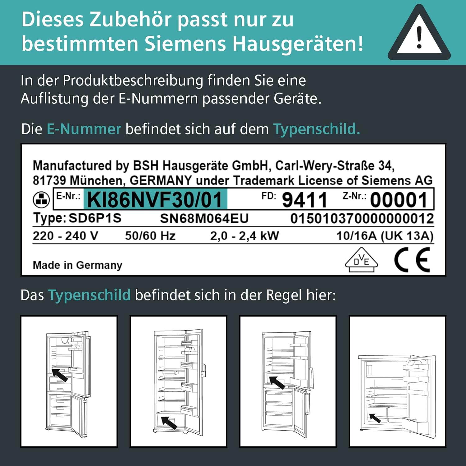 • ACHTUNG: Bitte prüfen Sie, ob dieses Zubehör zu Ihrem freistehenden Siemens Kühlgerät passt. Unten in der Produktbeschreibung finden Sie eine Auflistung von Gerätenummern (E-Nummern) der freistehenden Siemens Kühlgeräte, in die dieser
