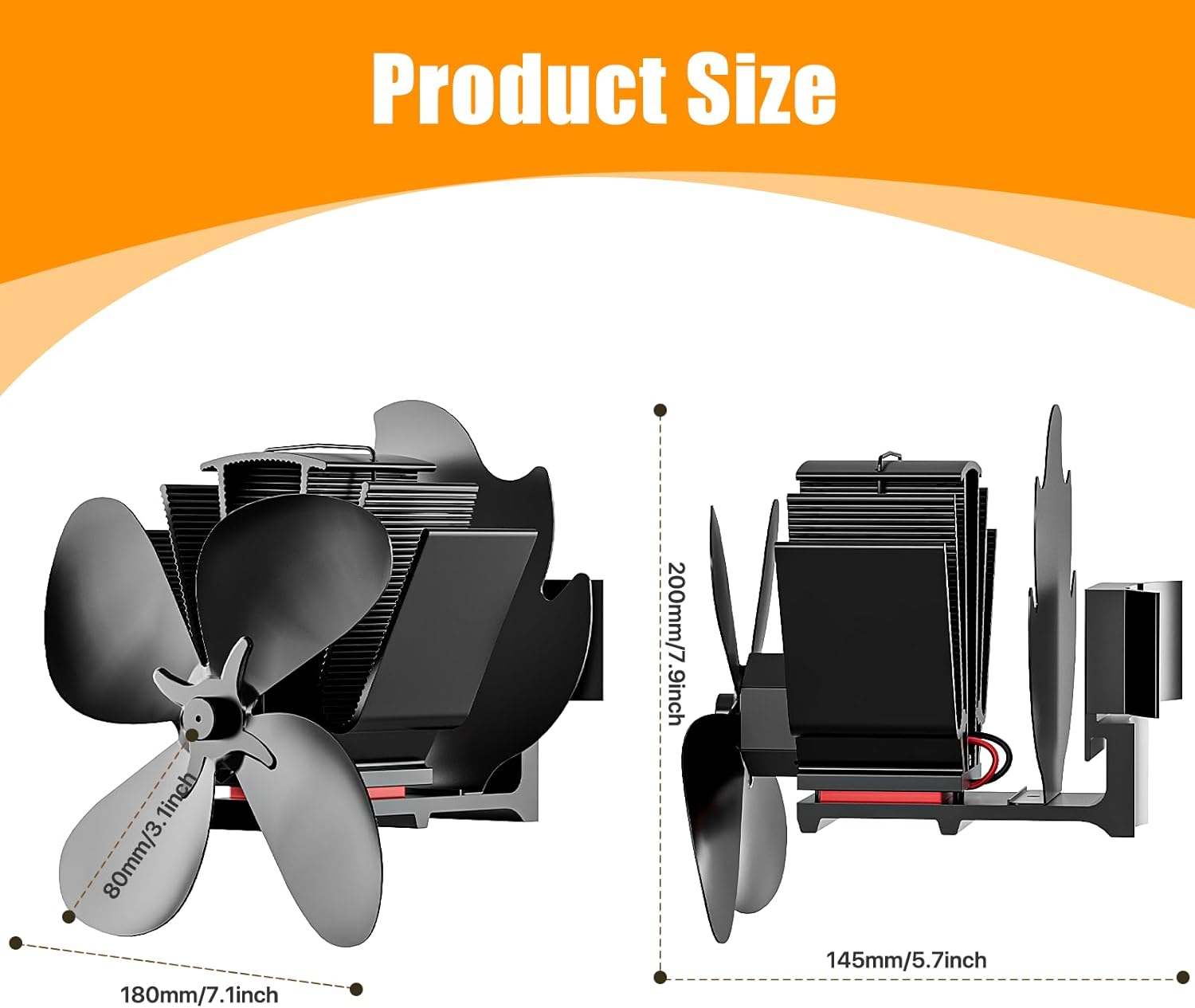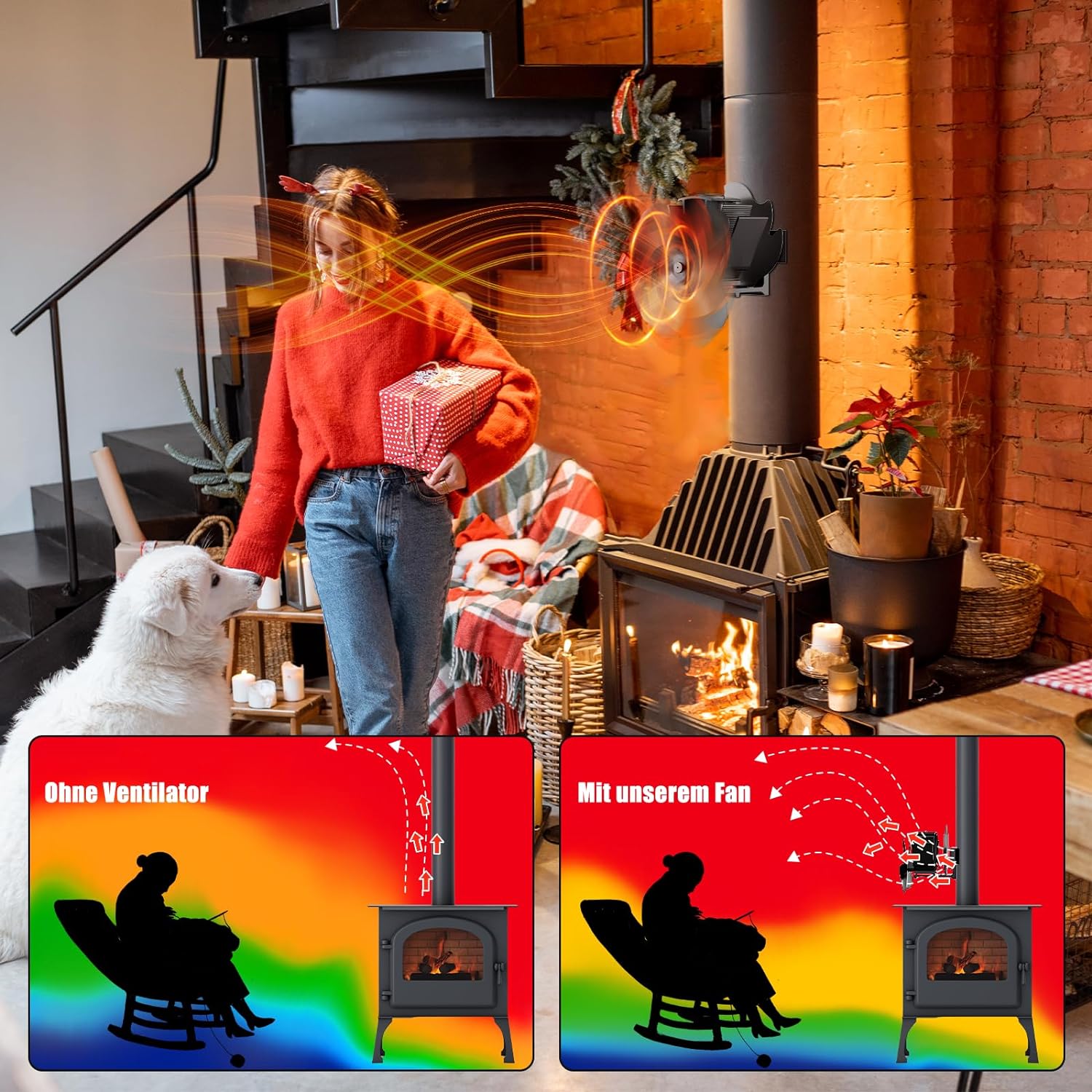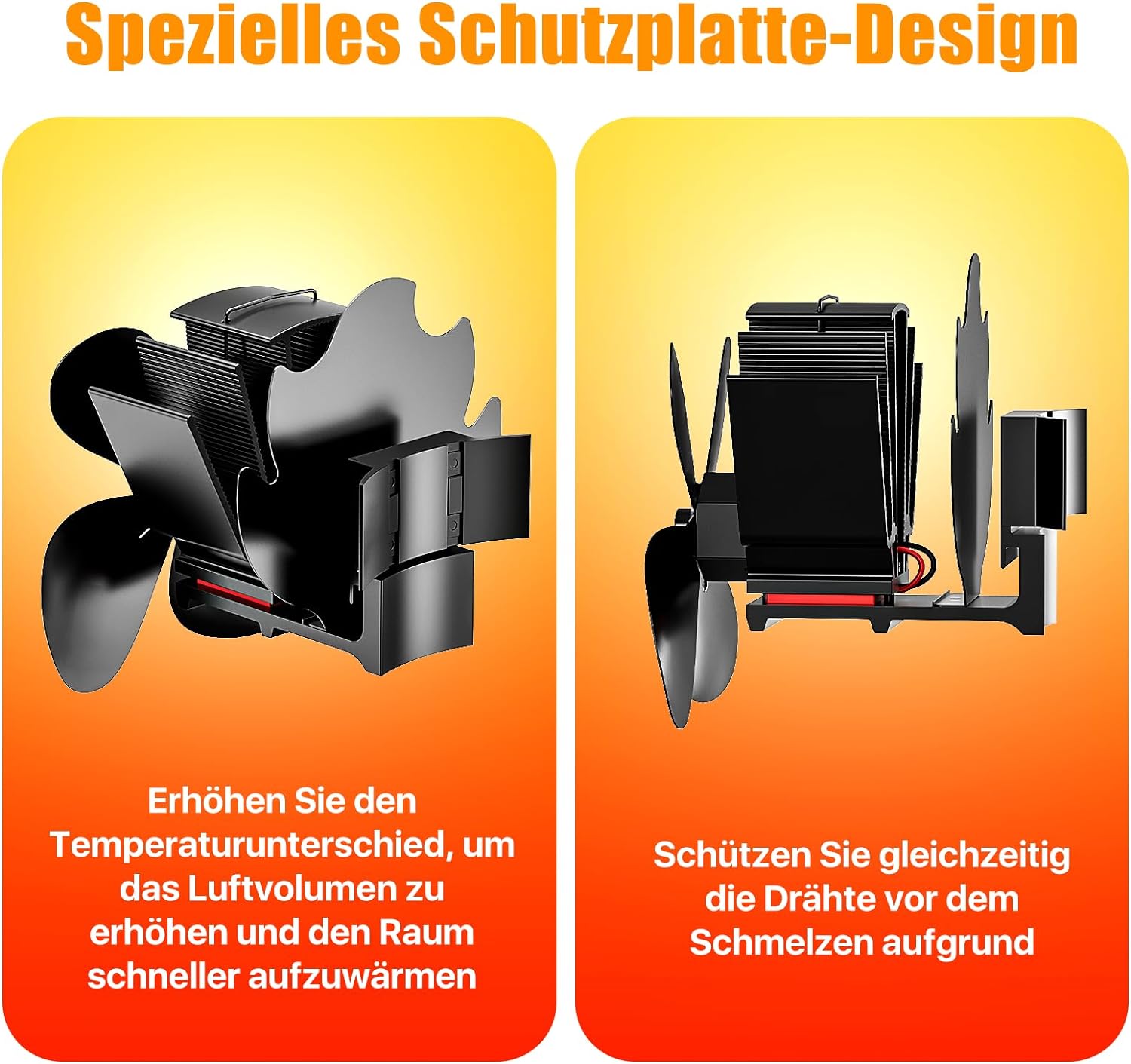 • *Upgrade-Modell 2023, Hoher Effizienz: Die neu aufgerüstete Rückseite des Lüfterflügels ist mit einem Hitzeschild ausgestattet, der die Hitze des Schornsteins hinter dem Lüfterflügel abschneidet und den Temperaturunterschied erhöht. Je grösser der Temperaturunterschied, desto grösser ist die vom Motor erhaltene Spannung und desto höher ist die Drehzahl. Maximal Luftstrom entwickelt 160CFM. es kann die Wärme in kürzerer Zeit in alle Ecken des Raumes verteilen.