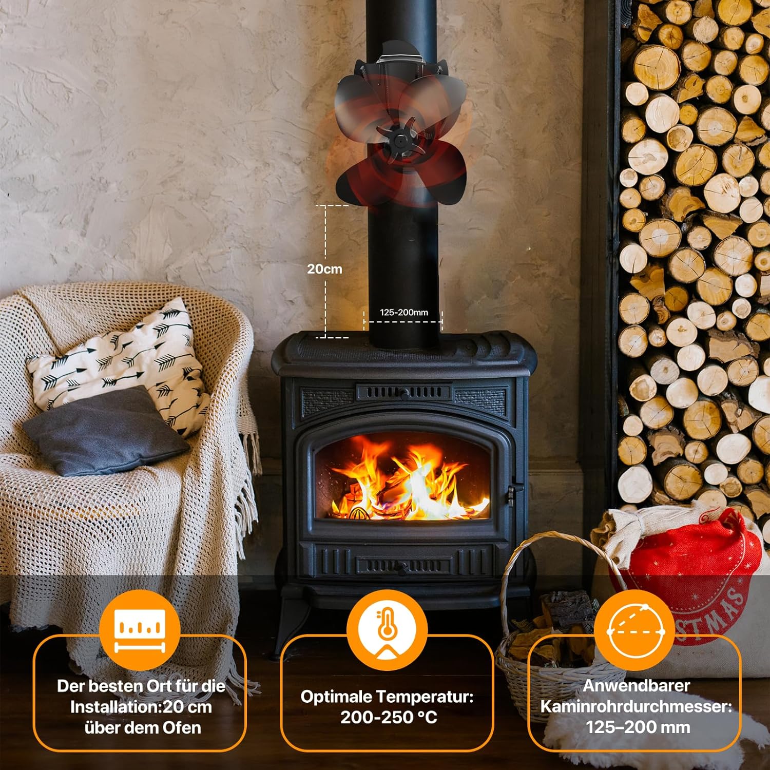 • *Ohne Strom, Umweltschutz und Nahezu geräuschloser Betrieb: Der Hauptvorteil des Kaminlüfters besteht darin, kann er die Wärme gleichmässig im Raum verteilen, was zu einer effizienteren Heizung führt. Dadurch wird die Wärmeleistung des Kamins maximiert und es wird weniger Brennstoff benötigt. Ausserdem sorgt Kaminventilator für eine schnellere Zirkulation der warmen Luft im Raum, was dazu beiträgt, wird der Raum insgesamt schneller aufgewärmt und ohne Lärm. Arbeitsdezibel ist weniger als 25 dB.