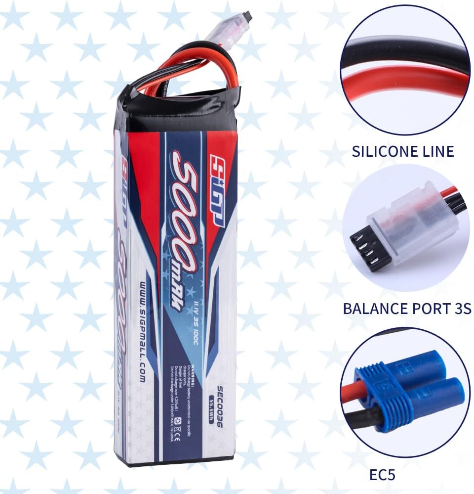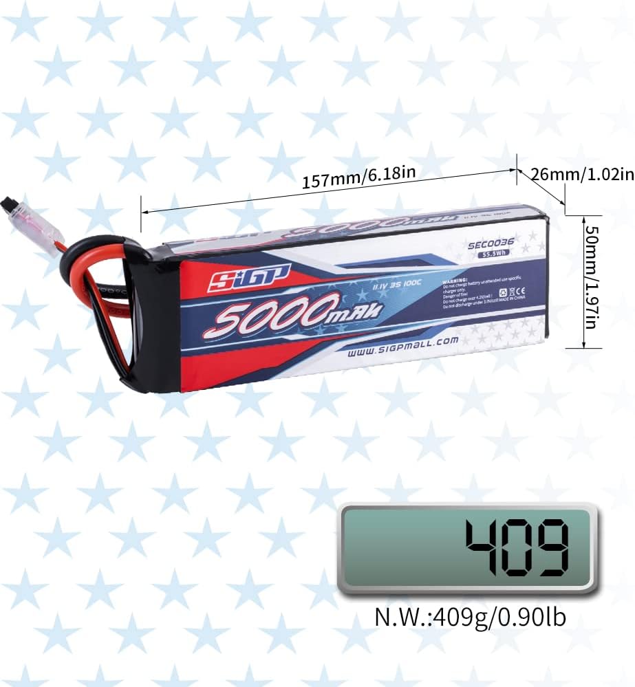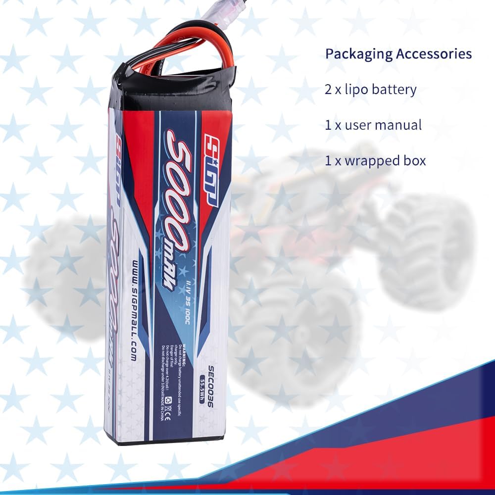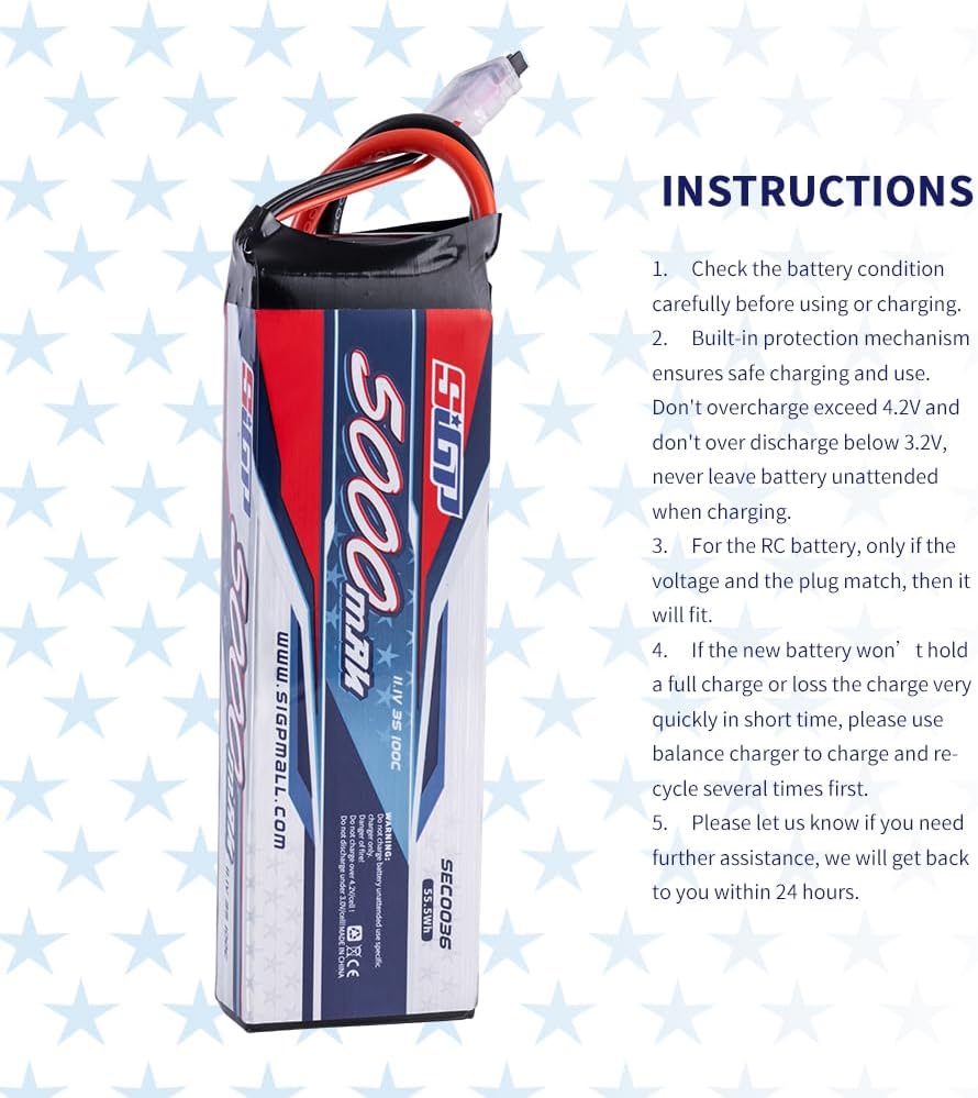 - đ„ăWhat You Getă- 2*3S 5000mAh 11.1v 100C lipo battery.Each SIGP 3s lipo battery has 30 Days money back guarantee & 12 months warranty. Just contact us if you have any problems, we will reply you ASAP.