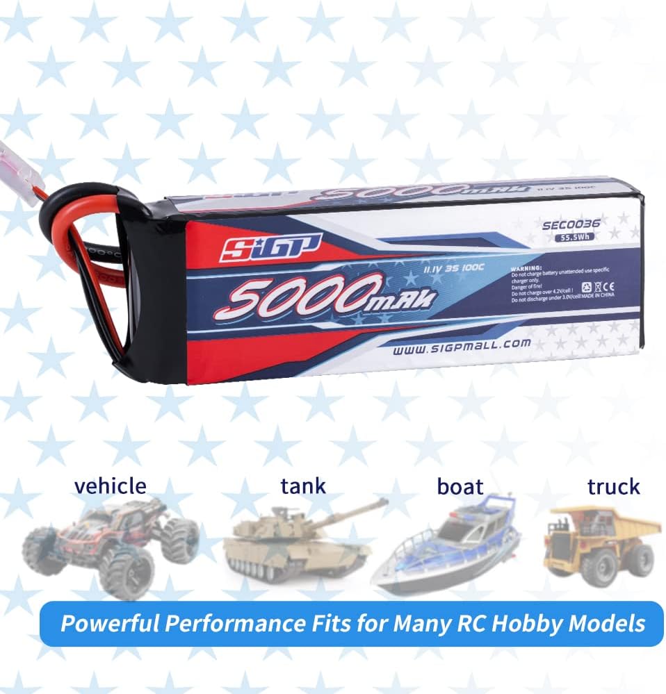 - đ„ăApplicationă- SIGP 5000mAh 11.1V 3S lipo battery suitable for RC car truck tank boat racing hobby(only if the voltage, dimension and the plug match, then it will fit).