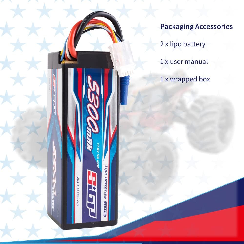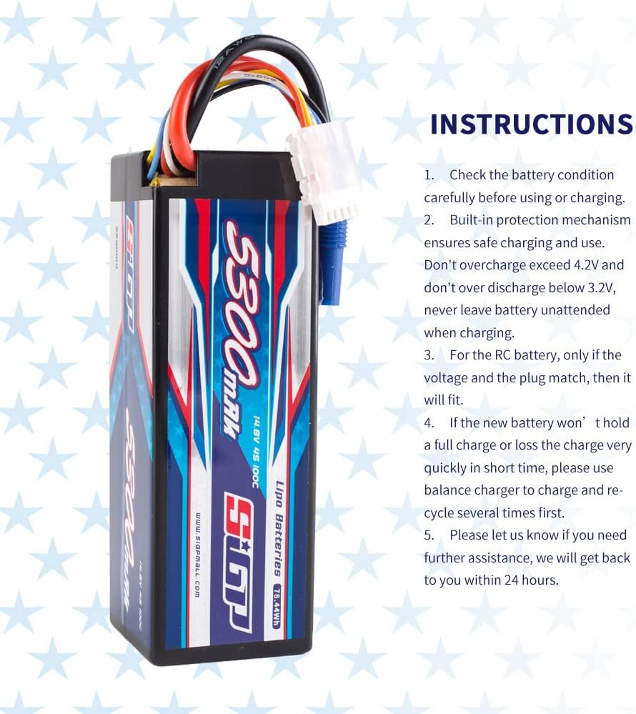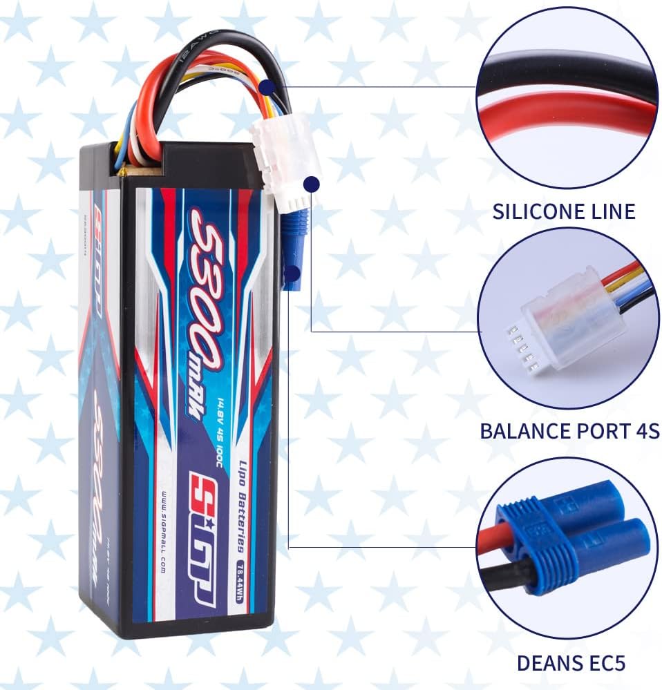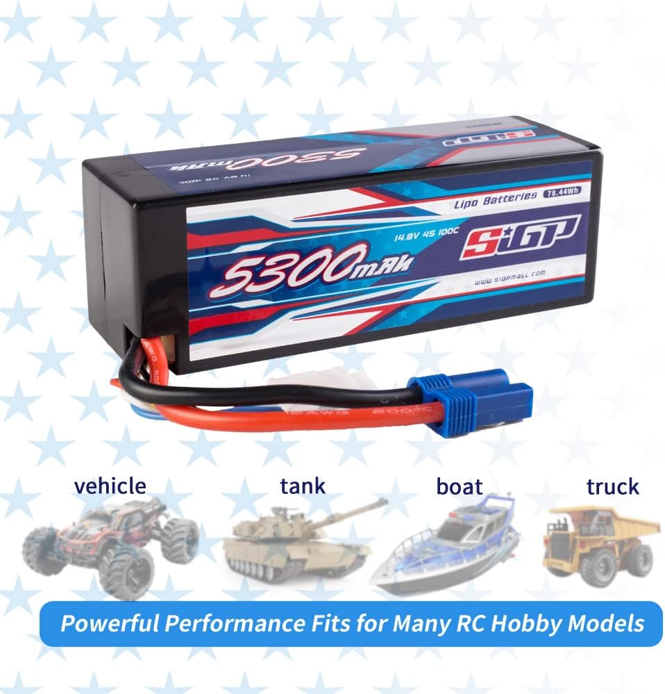 - đ„ ăAnwendungă- SIGP 5300mAh 14,8V 4S Lipo Akku geeignet fĂŒr RC Auto LKW Tank Boot Racing Hobby(nur wenn die Spannung, Dimension und der Stecker ĂŒbereinstimmen, dann wird es passen).