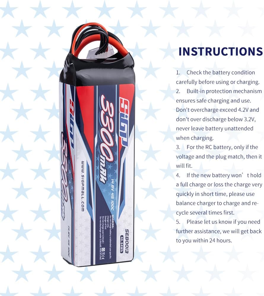 - đ„ăWhat You Getă- 2*4S 3300mAh 14.8v lipo battery.Each SIGP 4s lipo battery has 30 Days money back guarantee & 12 months warranty. Just contact us if you have any problems, we will reply you ASAP.