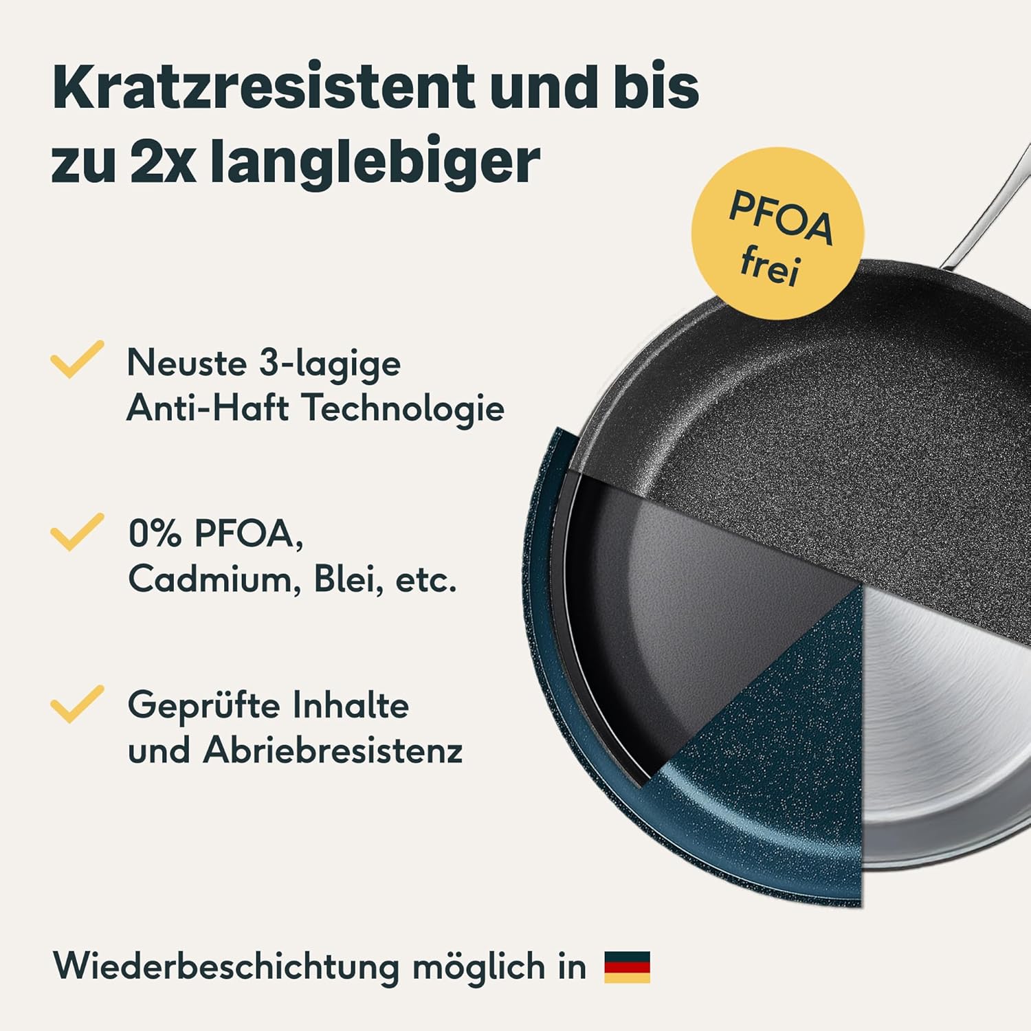 • ✔ STRESSFREI - Braten ohne Ankleben, dank erstklassiger Oberflächenveredelung. Kleckerfreies Ausgiessen, dank umlaufendem Schüttrand. Verringert Fettspritzer am Herd und erleichtert die Reinigung nach dem Kochen.