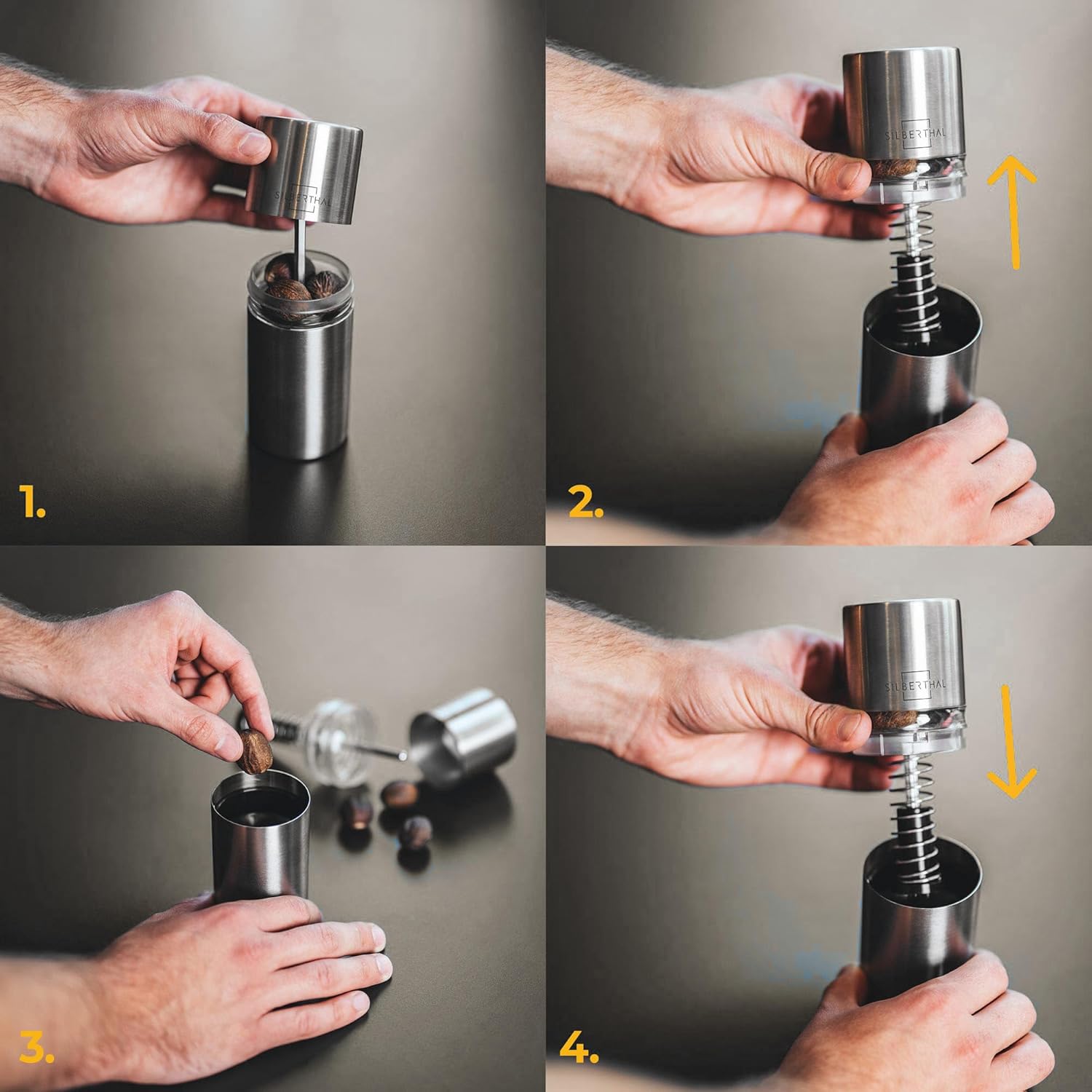 - ✔ 4 Nüsse direkt aufbewahren - Gewürzmühle besteht aus zwei Teilen. Eine davon erlaubt es bis zu 4 Muskatnüsse aufzubewahren und sie somit aromatisch zu versiegeln.