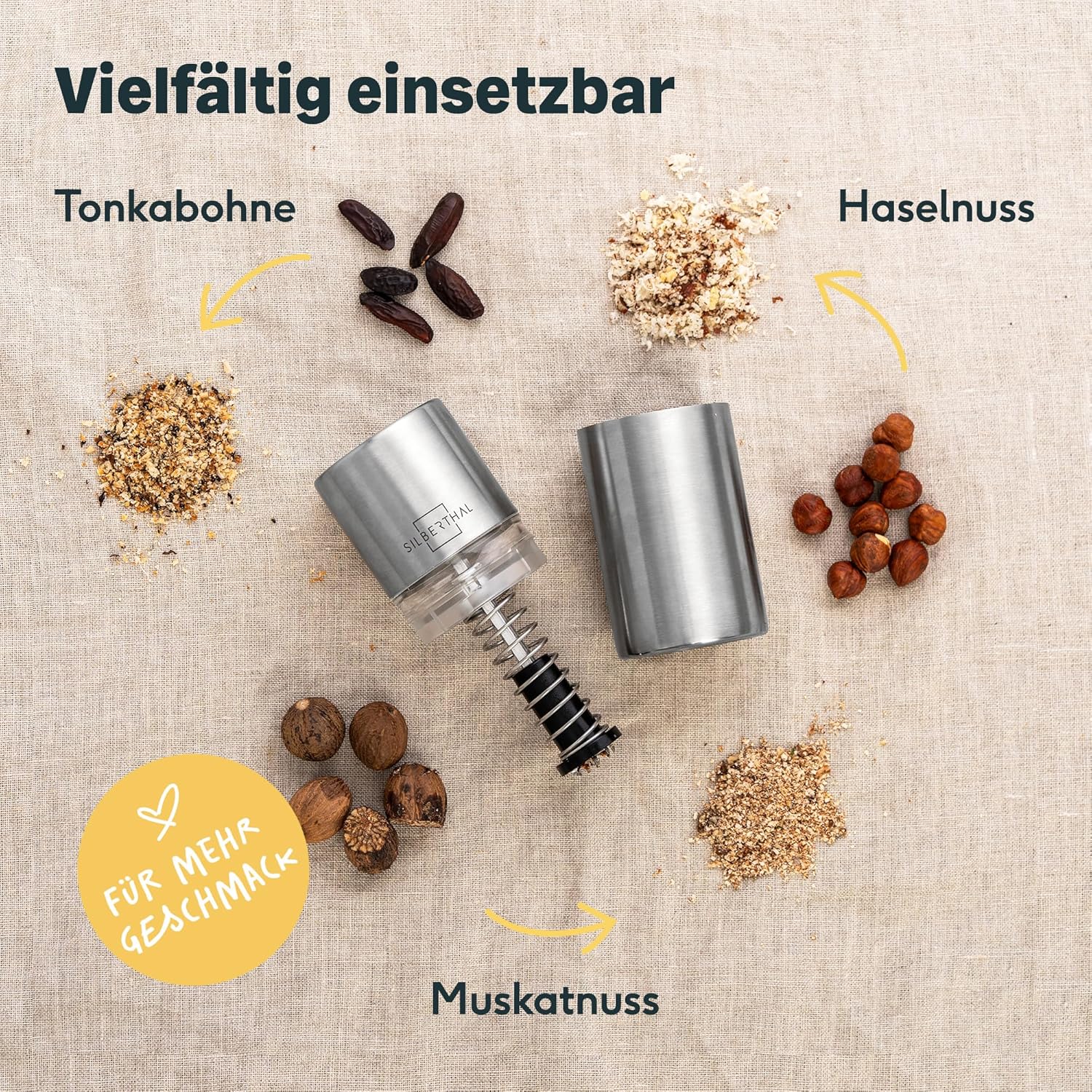 - ✔ Reiben ohne, dass die Muskatnuss von der Reibe abrutscht und man sich verletzt. Lediglich die Nuss einlegen und durch Drehen das Gericht nach Belieben würzen. Langlebiges und scharfes Mahlwerk aus Edelstahl.