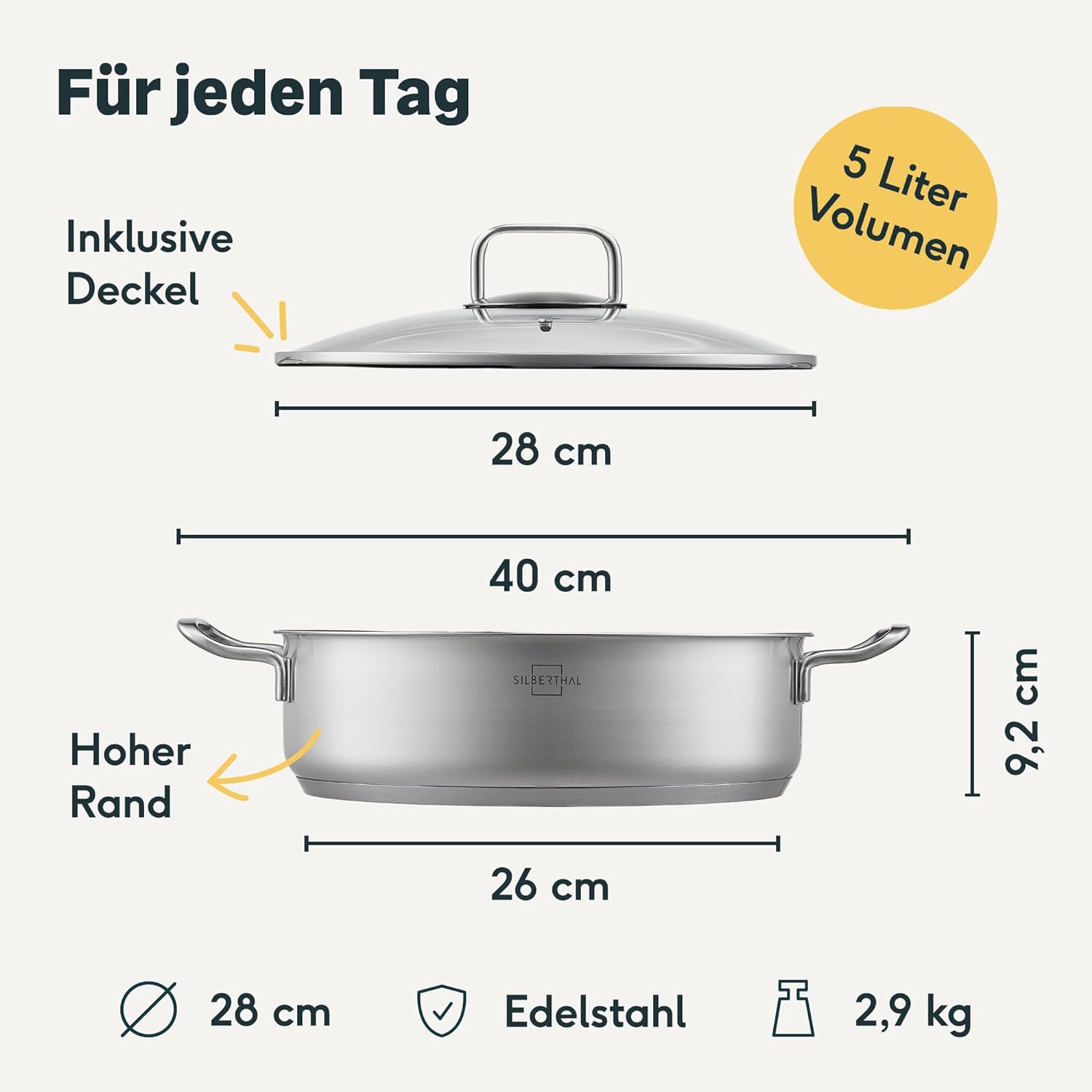 SILBERTHAL Servierpfanne 28 cm hoher Rand - Induktion - Edelstahl - Beschichtete Schmorpfanne mit De