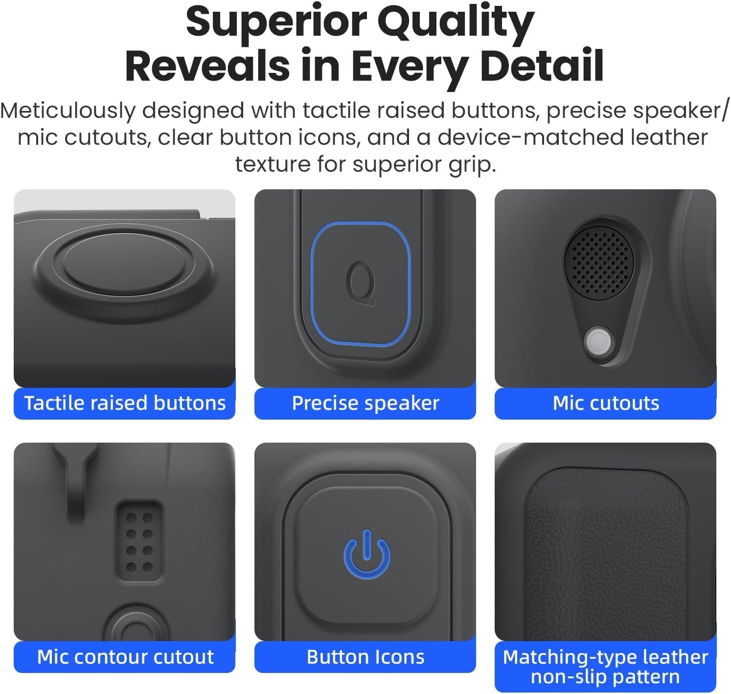 - Sorgfältig gestaltet mit taktilen, erhabenen Tasten, präzisen Lautsprecher-/Mikrofon-Aussparungen, klaren Tastensymbolen und einer gerätespezifischen Lederstruktur für hervorragenden Halt.