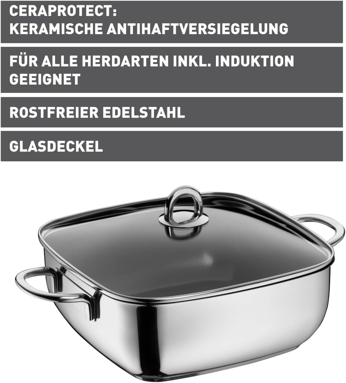- Inhalt: 1x Edelstahl Bräter beschichtet (29 x 29 x 10 cm), 1x Glasdeckel - Artikelnummer: 2130256434
