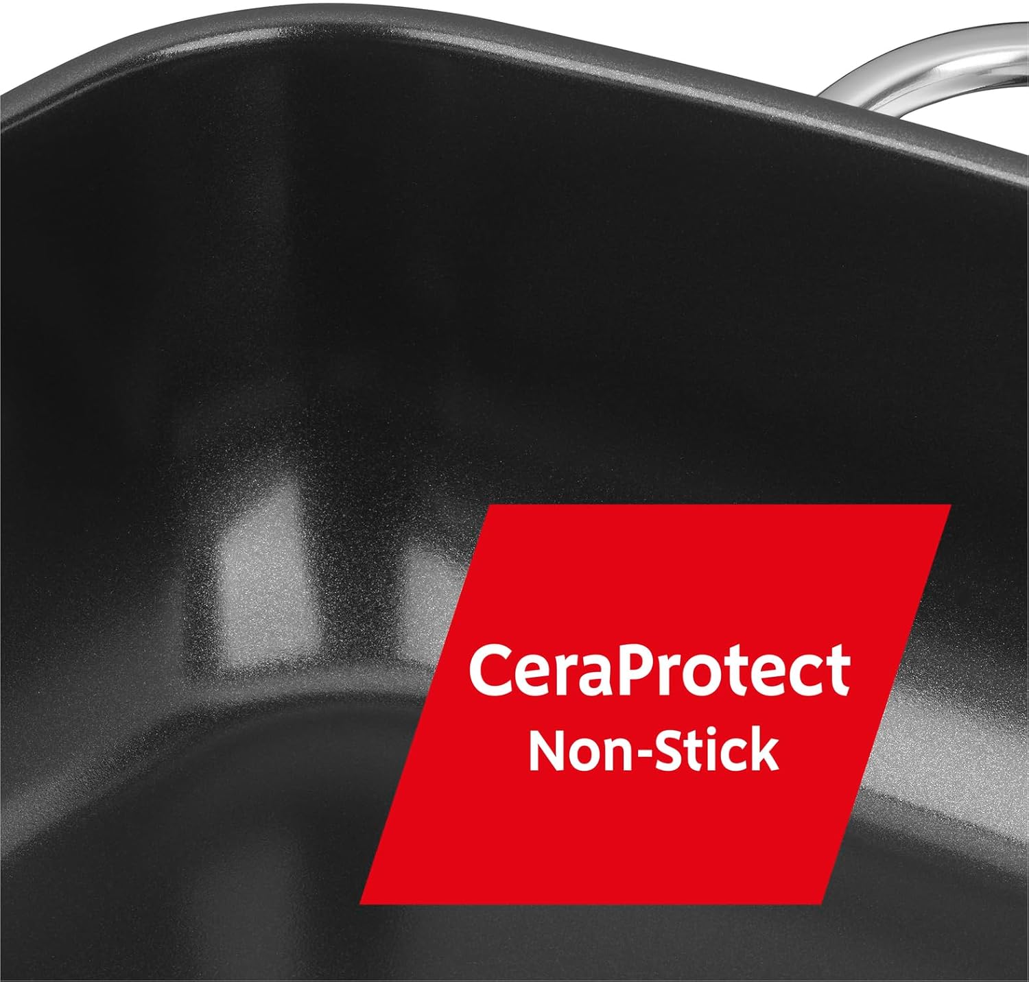 - Kein Anhaften der Speisen durch keramische Antihaftbeschichtung CeraProtect. Beste Antihafteigenschaften auch bei wenig Fett von z.B. Fleisch oder schonend gegartem Gemüse