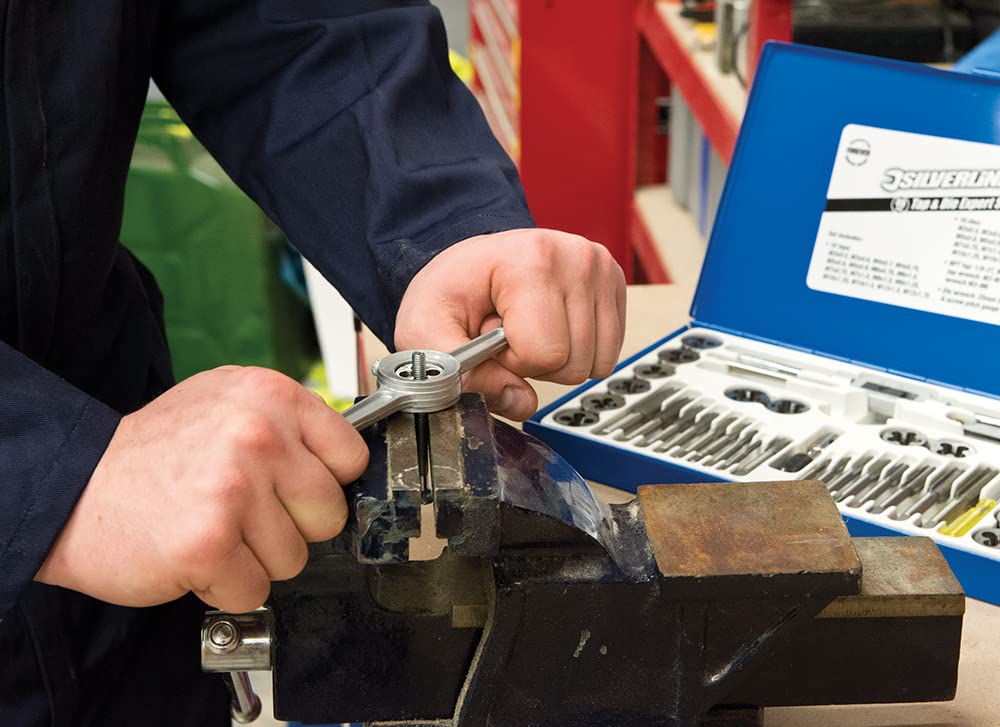 • inklusive Gabelgewindeschneider, Schraubendreher, T-Griff Schlüssel, Gewindesteigungsmesser, Gewindebohrer und Schneideisen: M3x0,5, M3x0,6, M7x0.75, M4x0,7, M4x0,75, M5x0,8, M5x0,9, M6x0,75, M6x1,0, M7x1,0, M8x1,0, M8x1,25, M10x1,25, M12x1,5, M12x1,75