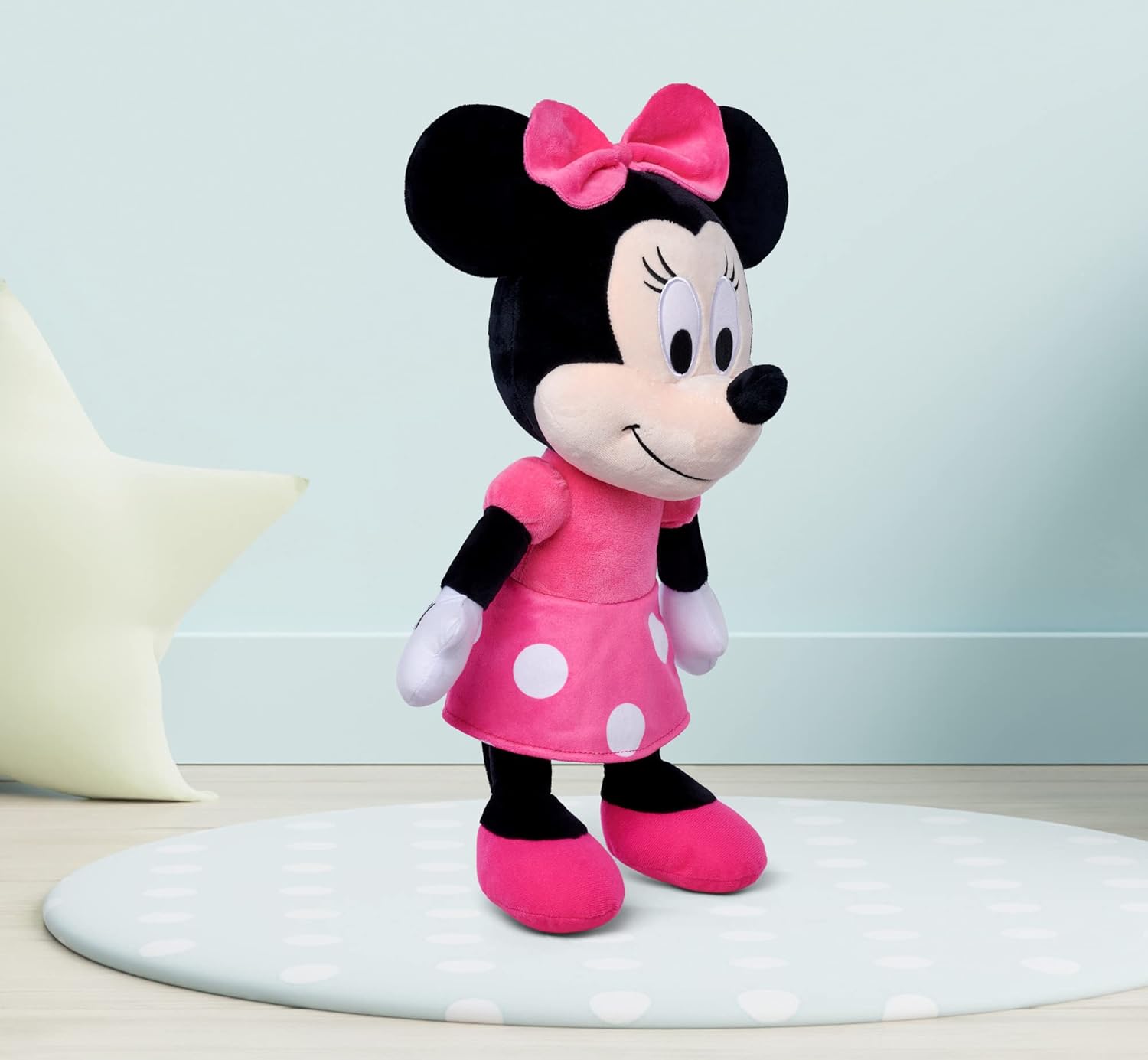 - Die 48cm grosse Minnie trägt ein pinkfarbenes Kleid mit weissen Punkten auf dem Rock, hat eine farblich passende Schleife auf dem Kopf und ist aus kuschelweichem Plüsch