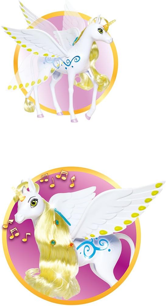 - Haarclips und Bürste - neben dem 25cm grossen Einhorn sind im Set auch Haarclips und eine kleine goldene Bürste zum Frisieren und Stylen der blonden Mähne enthalten. Geeignet für Kinder ab 3 Jahren