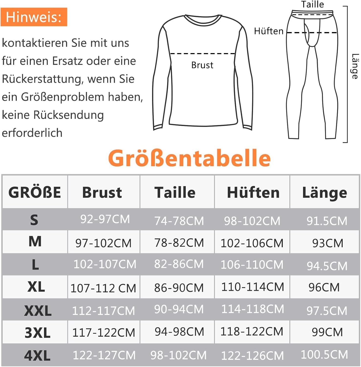 • Hinweis und Kundenservice: Lesen Sie bitte genau die Grössentabelle, bevor Sie die Thermounterwäsche Set bestellen. Wenn Sie einige Grösse- oder Qualitätsproblemen haben, nehmen Sie bitte zuerst mit uns Kontakt auf, wir werden Ihnen eine zufriedene