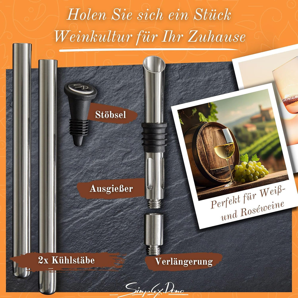 - 🍷 2x WEINKÜHLSTAB FÜR DOPPELTEN KÜHLGENUSS – Geniessen Sie extra lange gekühlten Wein mit diesem Set, das zwei Edelstahl-Weinkühlstäbe enthält. Perfekt für ausgedehnte Dinnerpartys oder den Sommerabend.