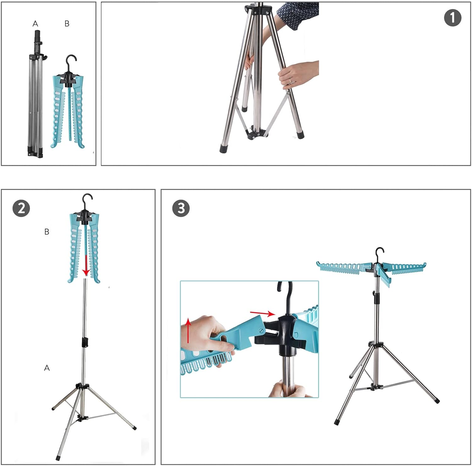 - 👗Der praktische Wäscheständer verfügt über drei solide, ausklappbare Arme mit Bügellöchern, die Platz für bis zu 27 Kleiderbügel bieten. Es kann damit bis zu 30 KG Gewicht- das entspricht in etwa 2 Waschladungen- tragen.