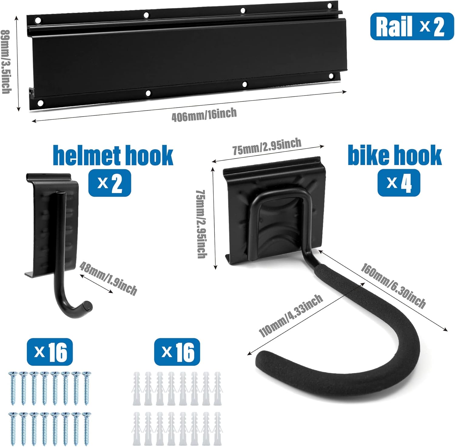 - 🔥🔥Paket beinhaltet: 4 Fahrradhaken + 2 Helmhaken + 2 Hakenführungsschienen, Fahrradhakenspezifikation 75 * 160 * 110 mm, Helmspezifikation 100 * 38 * 2 mm, Plattenspezifikation 405 * 100 * 2 mm, geeignet zum Abstellen von 4 Fahrrädern.