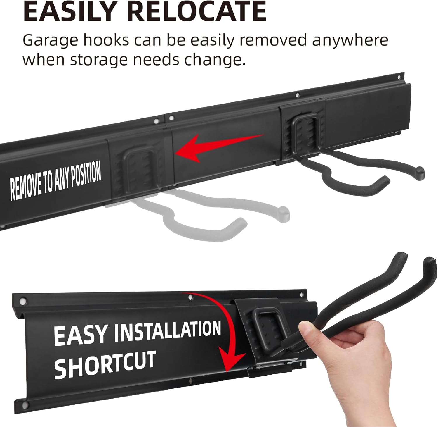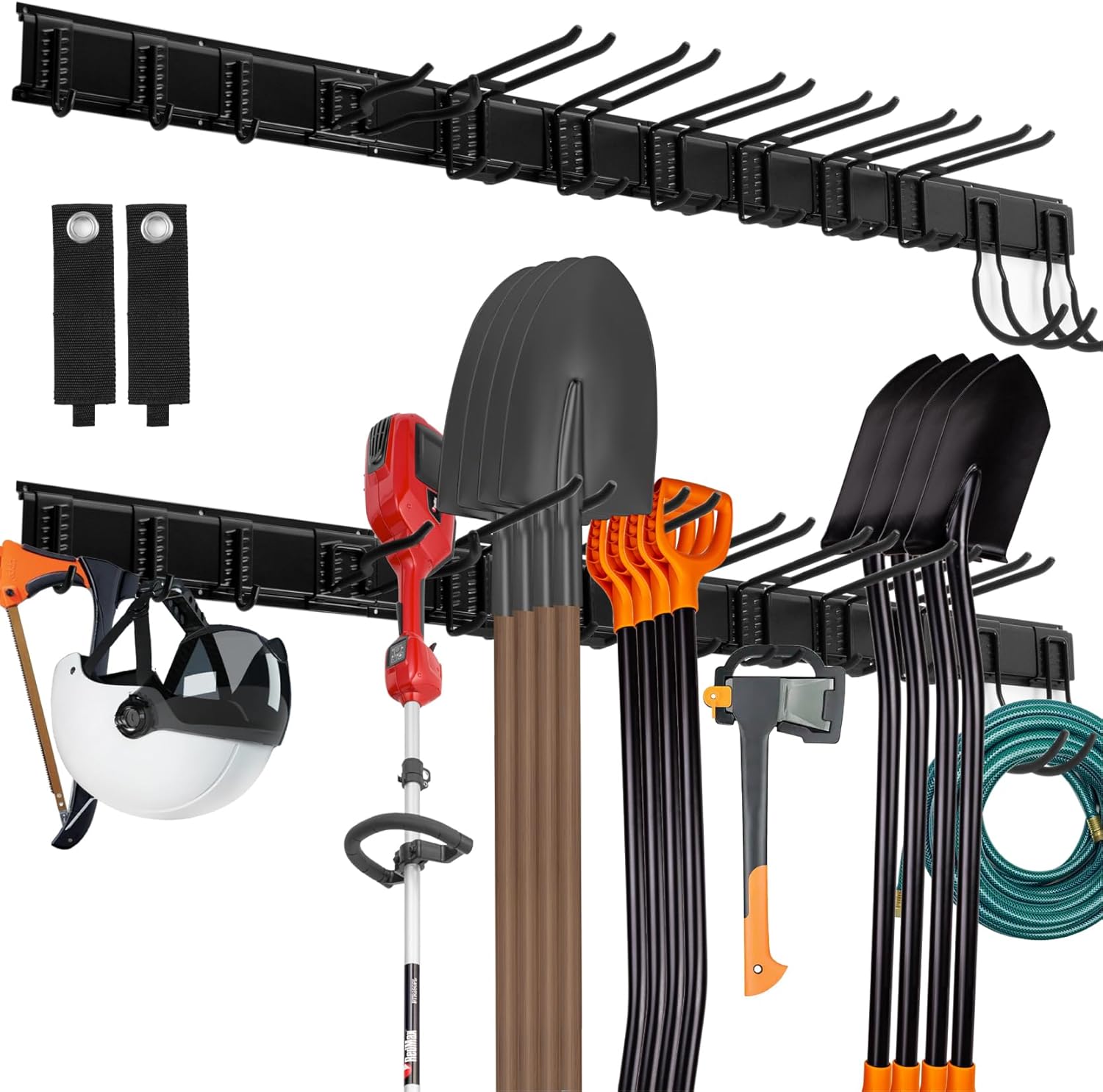 - 👍 Dieses Garagenwandwerkzeugregal kann verschiedene Werkzeuge aufnehmen, wie Gartenwerkzeuge, Schaufeln, Rechen, Besen, Seile, Schläuche, Elektrowerkzeuge, Heckenscheren, Schneeschaufeln, Skiausrüstung usw. Alle verstellbaren Haken können an die