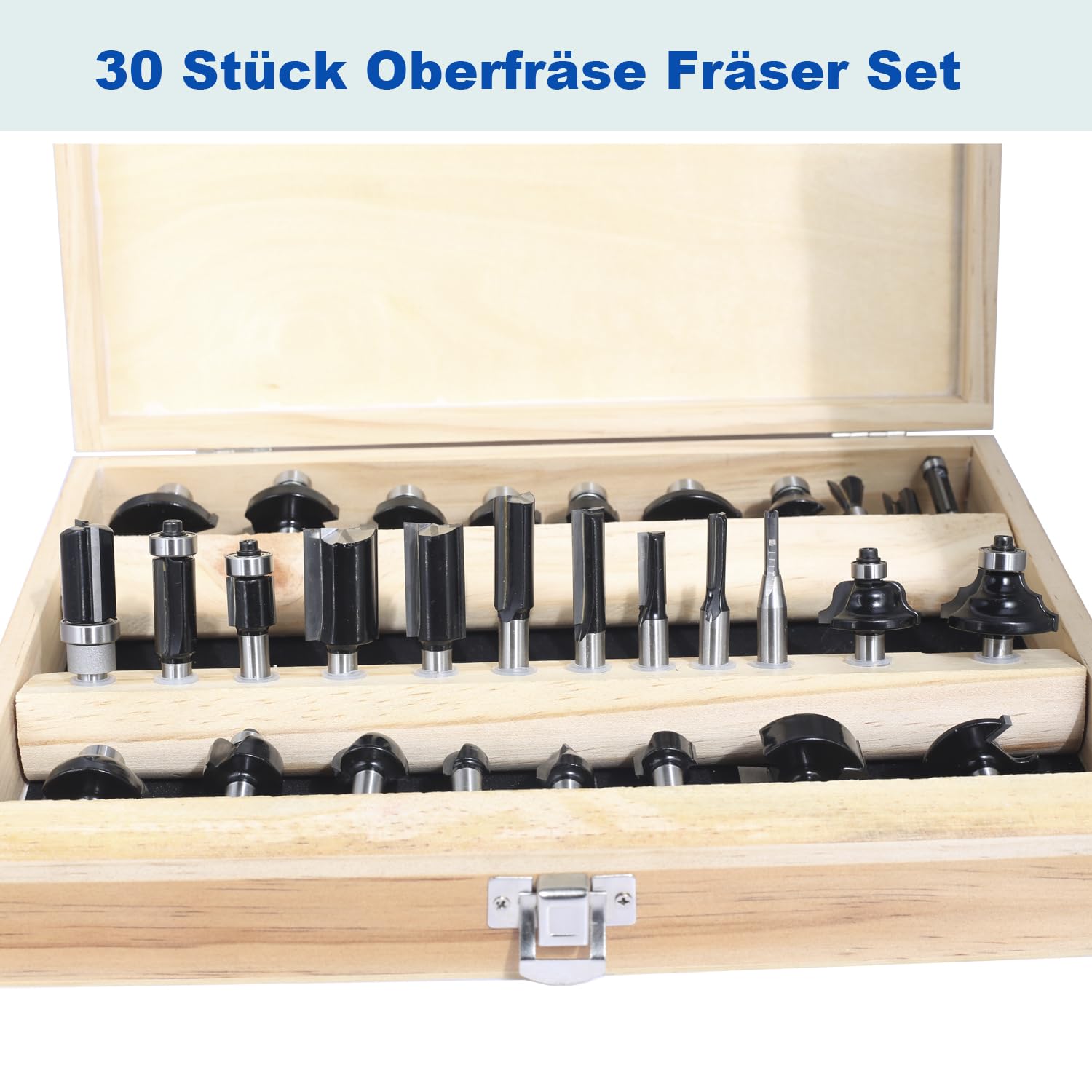 - 🔨【Product Details】Sinoprotools 30-tlg Oberfräse Fräser Set: Schneidiger Nutfräser Φ4mm 3*2-schneidiger Nutfräser Φ6/8/10mm 3*3-schneidiger Nutfräser Φ12/16/20mm 5*Abrundfräser R 3,6,8,10,12mm Zinkenfräser Φ13mm x12° 2* V-Nutfräser