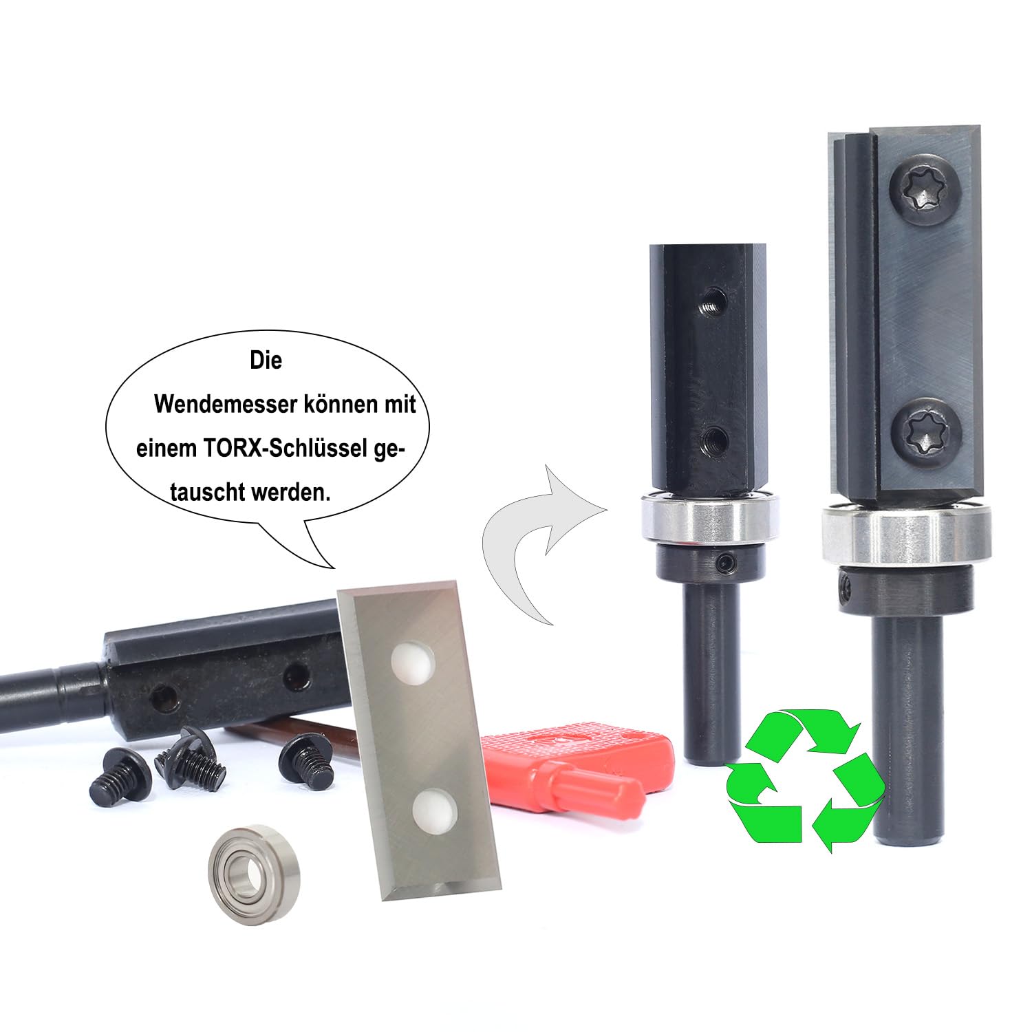 - ✅ Schaft 8mm, Durchmesser 19mm,Vierseitige Klinge, Schnittlänge 40mm mit auswechselbarem Kugellager,for Holzbearbeitung Bündig Trimmen.Wendemesser 4-seitig verwendbar