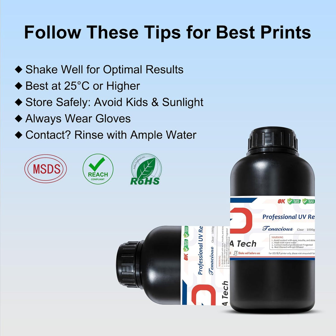 - EINFACH ZU DRUCKEN – Im Vergleich zu anderen flexiblen Harzen ist unser Siraya Tech Tenacious Harz einfacher zu drucken und flüssige Harze sind einfacher zu färben. Am besten bei 25°C oder höher drucken. Dieses flexible 405 nm UV-härtende Harz