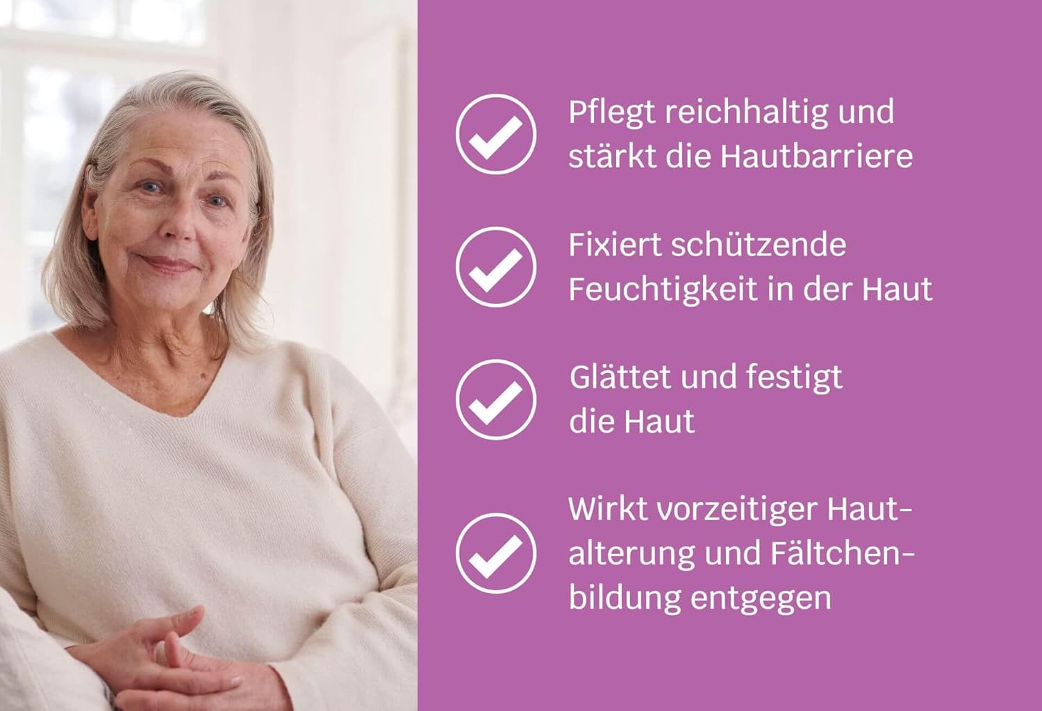 - Elastizität & Spannkraft der Haut werden effektiv unterstützt: Die Fältchen werden nachhaltig reduziert und der hautglättende Antiaging-Effekt bleibt über den ganzen Tag sichtbar erhalten.