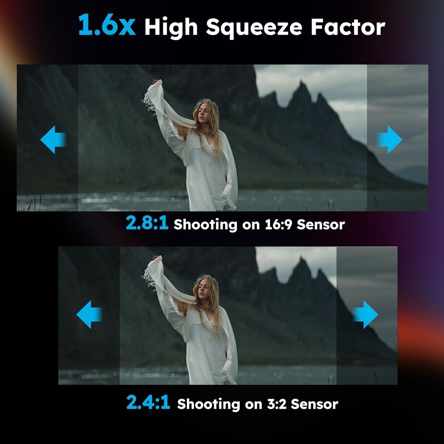 - Fesselnder anamorpher Look: Der 1,6-fache Quetschfaktor bringt auch einen attraktiven anamorphen Look, wie cremiges ovales Bokeh und ausgeprägte Science-Fi-Blaufackeln, was Ihrem Filmmaterial eine brillante filmische Atmosphäre verleiht.