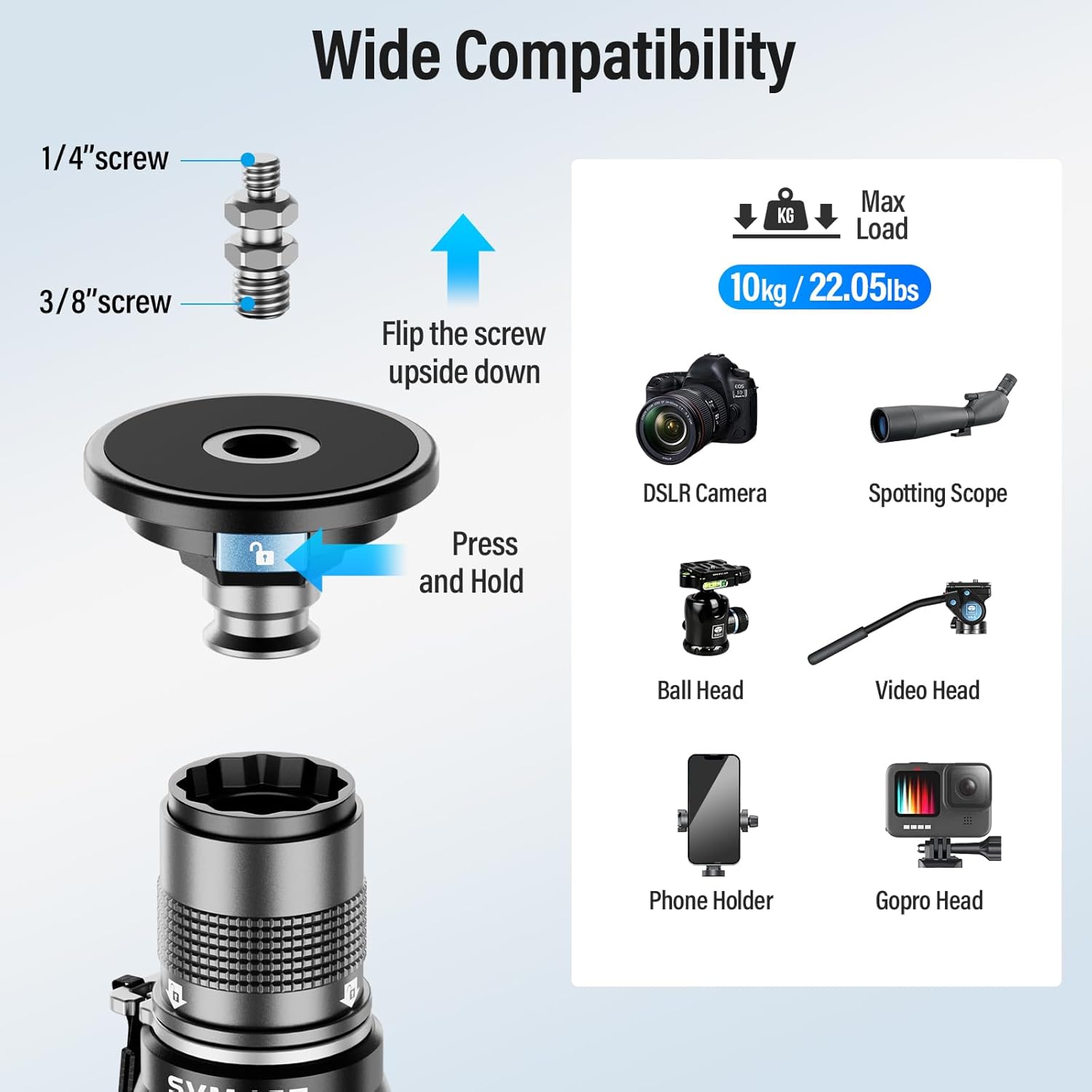 • 【Quick Lock/Release Head】Sowohl das Einbeinstativoberteil als auch die Stativbasis verfügen über das gleiche innovative Schnellverschluss-System. Ziehen Sie den Kragen nach unten, um die obere Platte zu lösen, oder setzen Sie die obere Platte ein,
