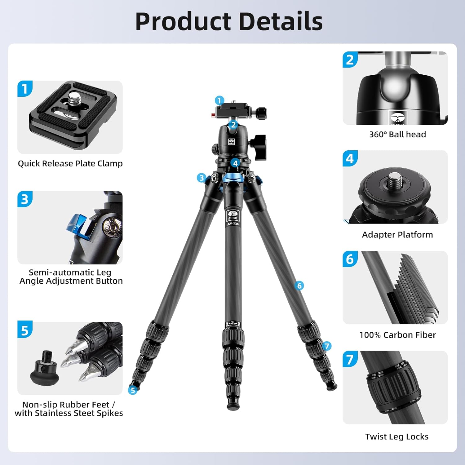 - 【Verstellbar und ausziehbar】 5-teilige Kohlefaser-Beine mit Schnellverschluss-Drehverschlüssen ermöglichen es Ihnen, die Arbeitshöhe von 7 cm bis 119,9 cm einzustellen. 3-Positionen-Beinwinkelverstellsystem kann flexible Aufnahmen für