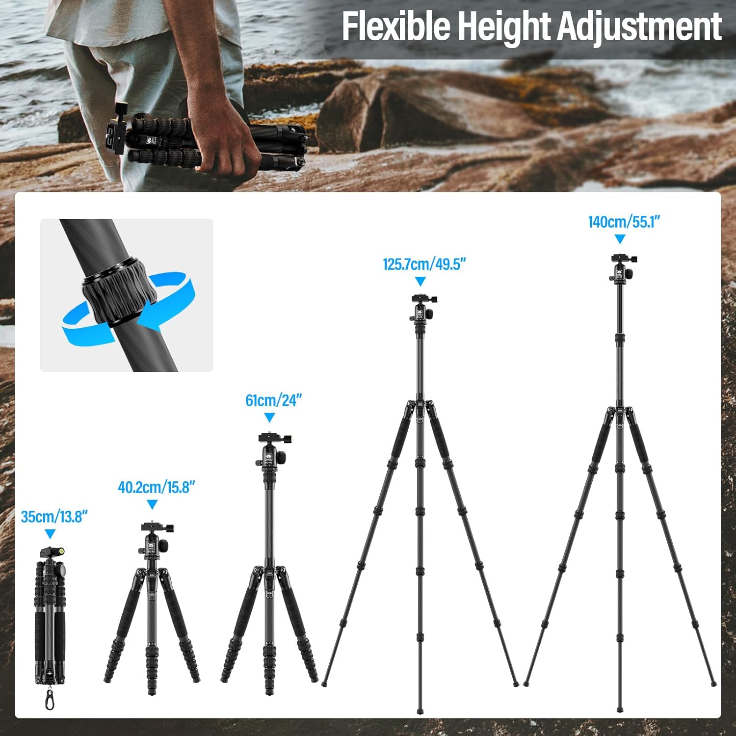 - Kompakt und ausziehbar: Dank der 5-segmentigen Carbonfaser-Beine und der 2-segmentigen Mittelsäule können Sie die Höhe von 16cm bis 140cm in Sekundenschnelle anpassen. Das umkehrbare Klappbeindesign ermöglicht ein kompaktes Packmass von 35 cm, ideal
