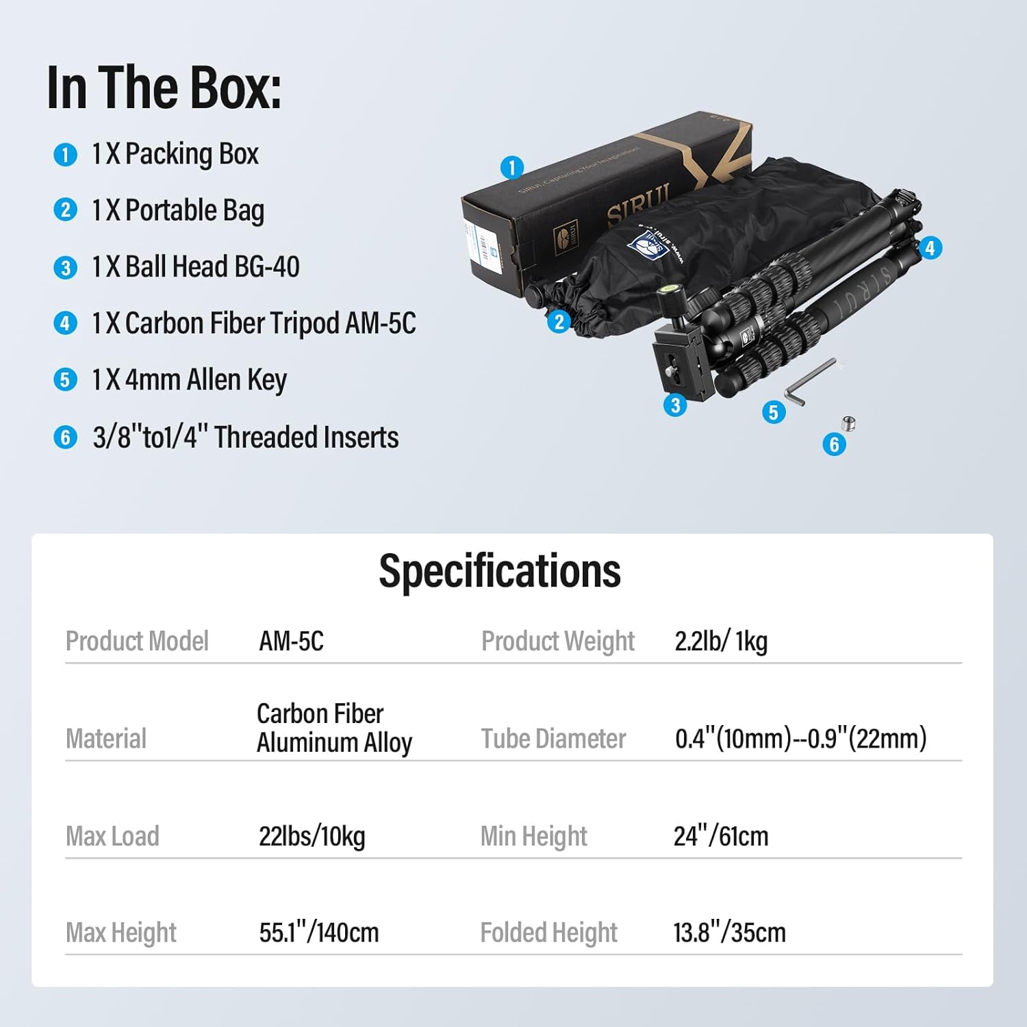 - Leicht und stabil: Das SIRUI Carbon-Reisestativ AM-5C kombiniert hochwertige Carbonfaser mit geringem Gewicht. Mit nur 1 kg Gewicht ist es leicht zu transportieren, trägt jedoch bis zu 10 kg. Ein integrierter Karabiner zum Aufhängen von Zusatzlasten