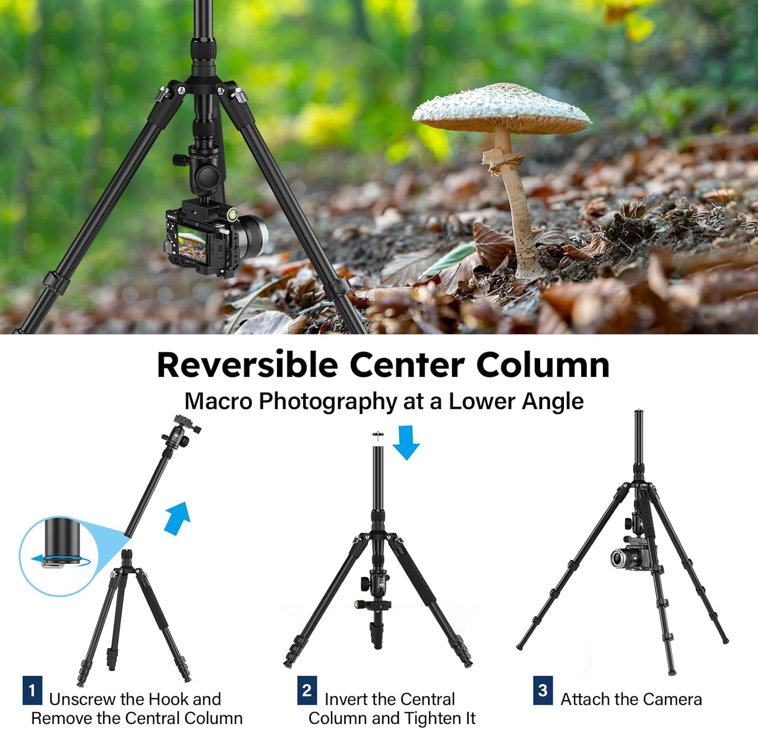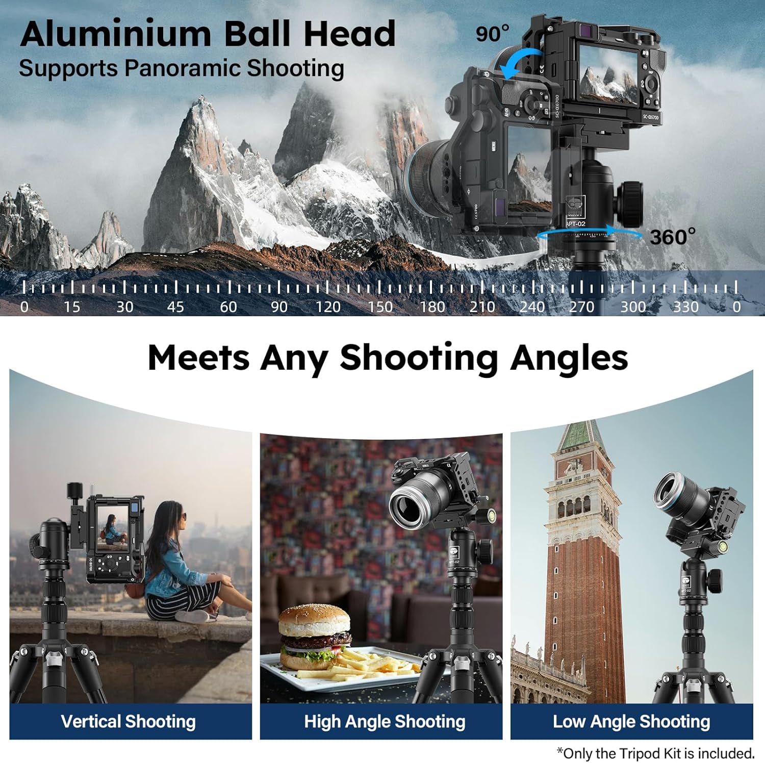 • 360° Kugelkopf & verstellbare Mittelsäule: Der Aluminium Kugelkopf ermöglicht eine 360°-Rotation und eine 90°-Neigung, sodass Sie aus jedem Winkel fotografieren können. Die Mittelsäule ist ausziehbar und kann umgekehrt montiert werden, was
