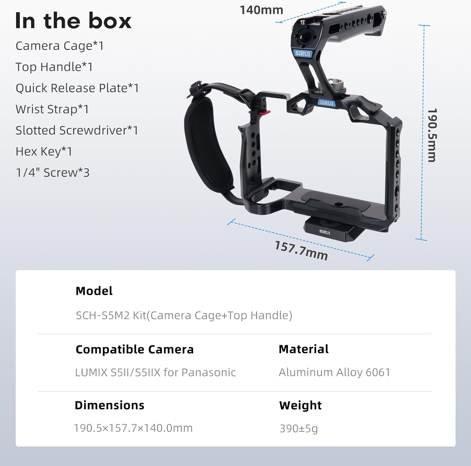 - 【Technische Daten】: Kompatible Kamera: Panasonic LUMIX S5II/S5IIX | Material: Aluminiumlegierung 6061 | Abmessungen: 190.5*157.7*140mm | Gewicht: 390±5g | Modell: SCH-S5M2 Kit