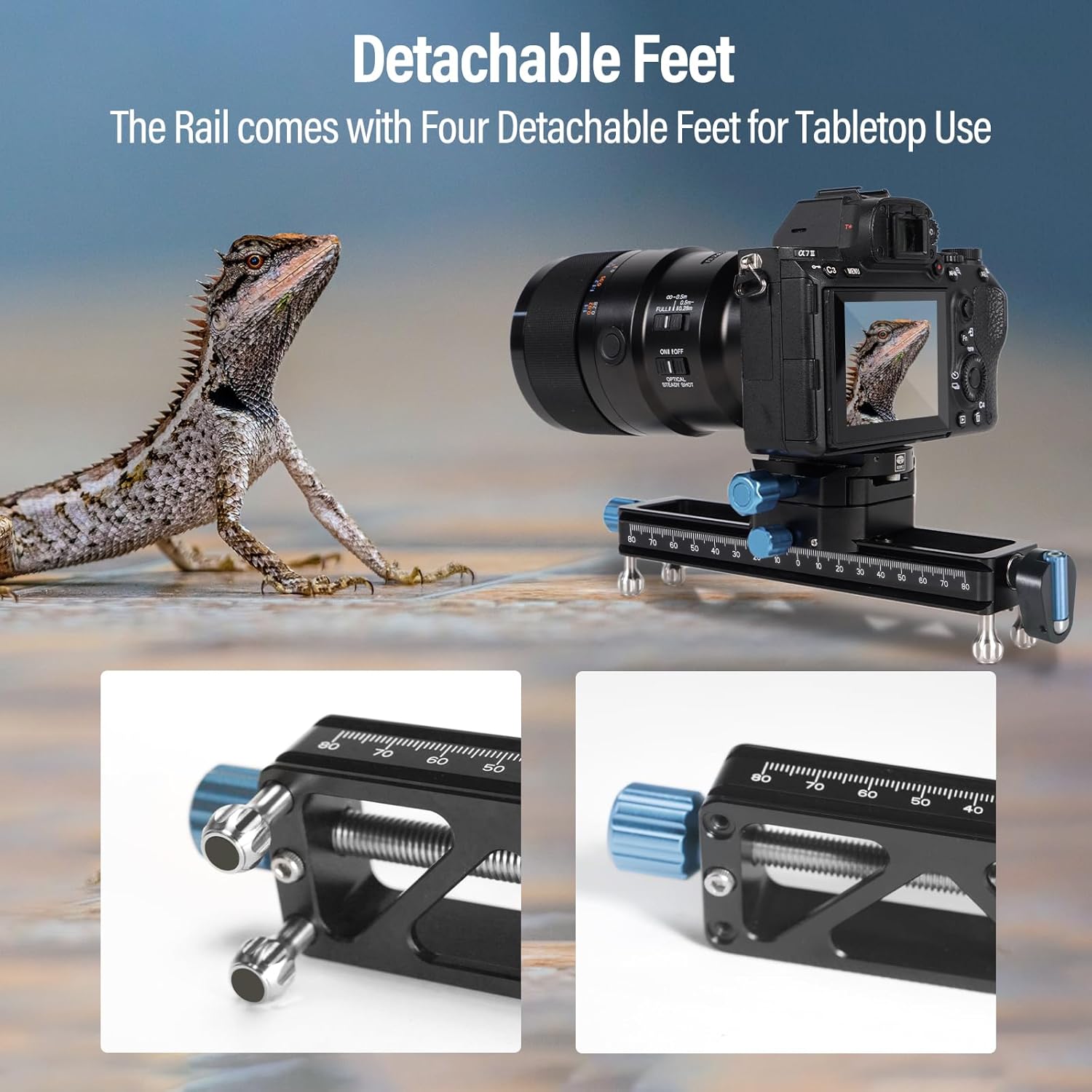 - Abnehmbare Füsse: Die Füsse der Makroschiene sind so konzipiert, dass sie abnehmbar sind, sodass sich dieses Werkzeug an Ihre verschiedenen Aufnahmeszenarien anpassen kann. Sie können die Füsse für Tischaufnahmen verwenden oder sie entfernen und